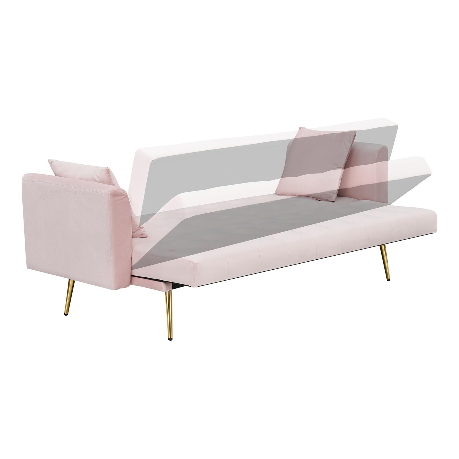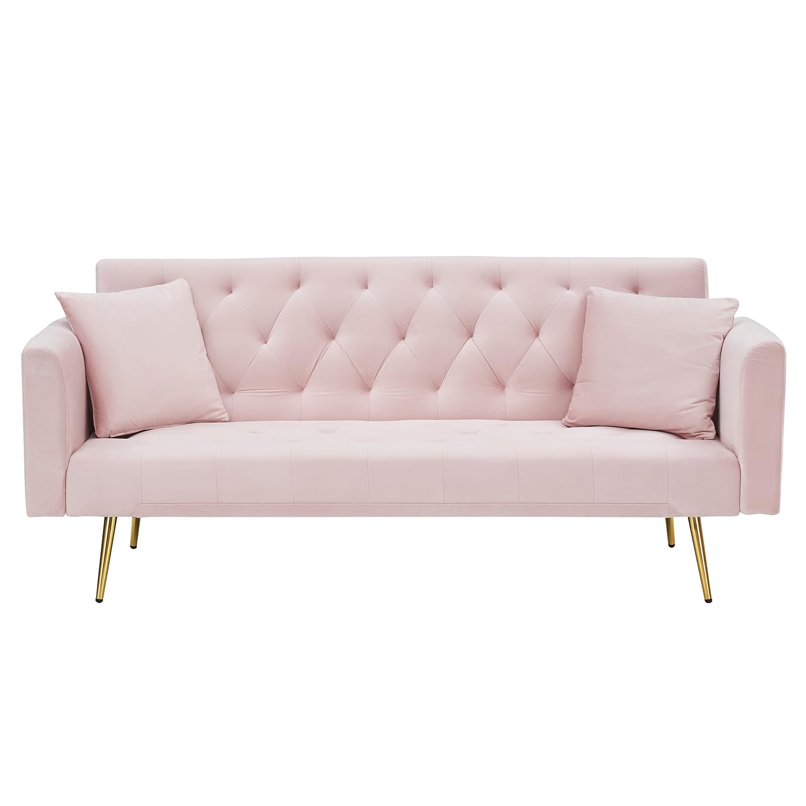 71" Modern Velvet Sofa Bed Futon, Convertible Sleeper Couch with Adjustable Backrest, Tufted Recliner Loveseat with Golden Chrome Legs & 2 Pillows for Small Spaces, Living Room, Apartment (Pink)