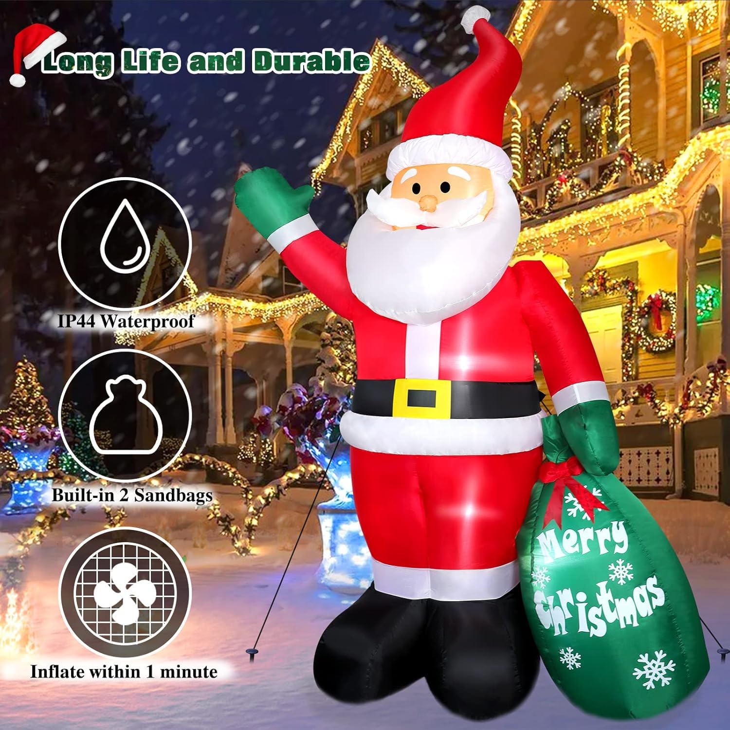 - 🎅 [Perfect for Christmas Decor]🎁The 8Ft Christmas inflatable Santa Claus with a large green Merry Christmas gift bag happily waves to everyone, bringing the greatest Christmas atmosphere. In addition, the built-in bright LED lights will light up the yard festively which is perfect for a Christmas night party, no matter whether it is indoor or outdoor, day or night, in rain or snow, it always gives you a beautiful and memorable Xmas holiday!