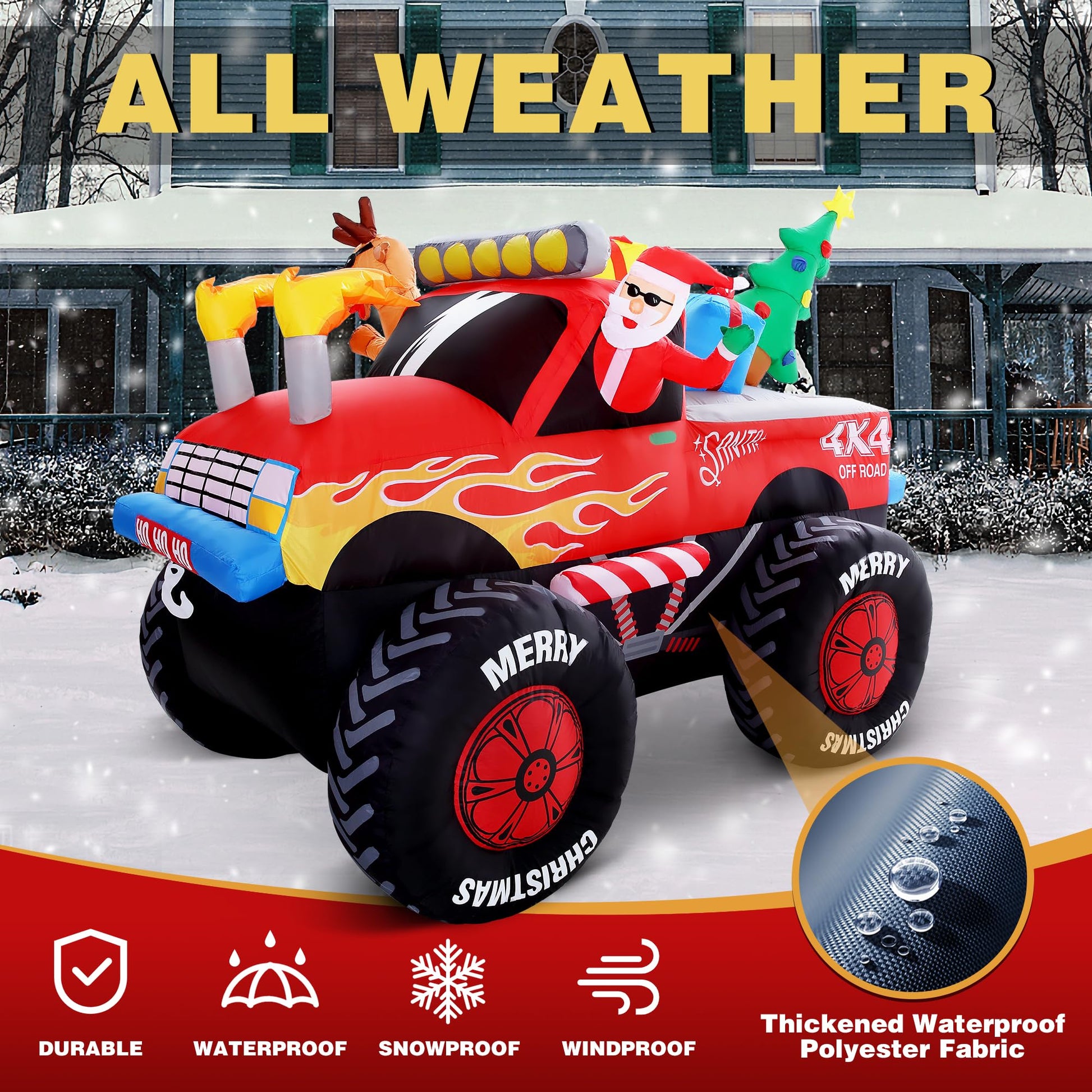 - Built-in LED Lights: There are 13 bright, energy-efficient LED lights within this Monster Truck Inflatable, making it stand out in the nighttime landscape. Add a spellbinding glow to your garden, yard, etc. with our giant Christmas decorations.