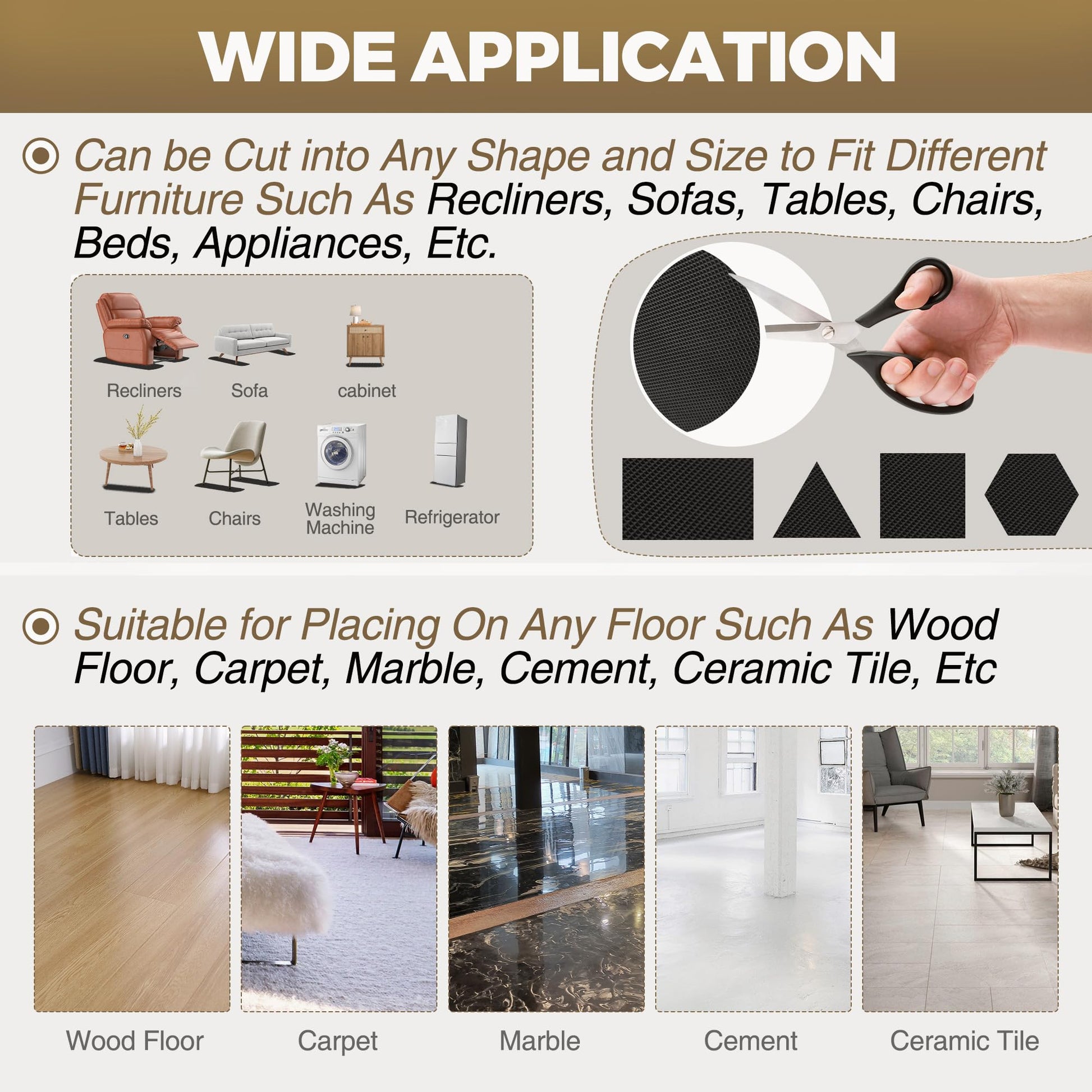 - 🛋️【WIDE APPLICATIONS】Ideal non slip furniture pads, cut into any shape according to the needs of furniture, fit to all of the home furniture such as sofa, recliner, couches, table, rocking chair. The anti-slip furniture pads work on hardwood floors, carpet, marble, cement, laminate, tile,vinyl floors are all surfaces.