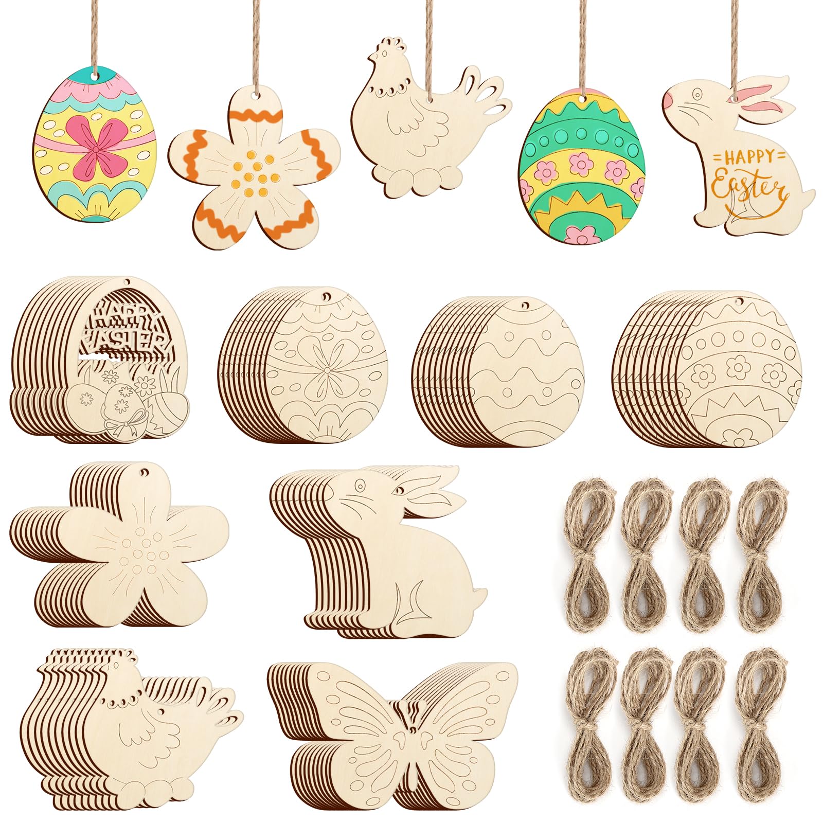 80PCS Wooden Spring Ornaments to Paint, 8 Styles DIY Blank Unfinished Wood Cutouts Ornament for Home Crafts Hanging Decorations, Insect Dragonfly Butterfly Snail Watering Can Mushroom Flower Shape