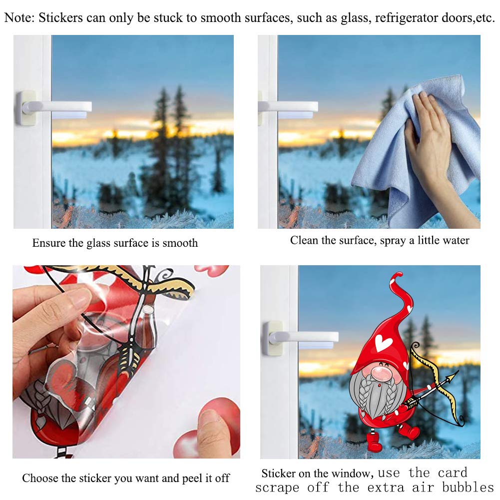 - Double Side & No adhesive: these Valentine's day window decals are double-sided, you can see the image from both sides of the window. Vivid and fresh color, warm the whole house and bring love. No need for glue, you can spray a little water on the surface before stick it on the window, water will make them stick better.
