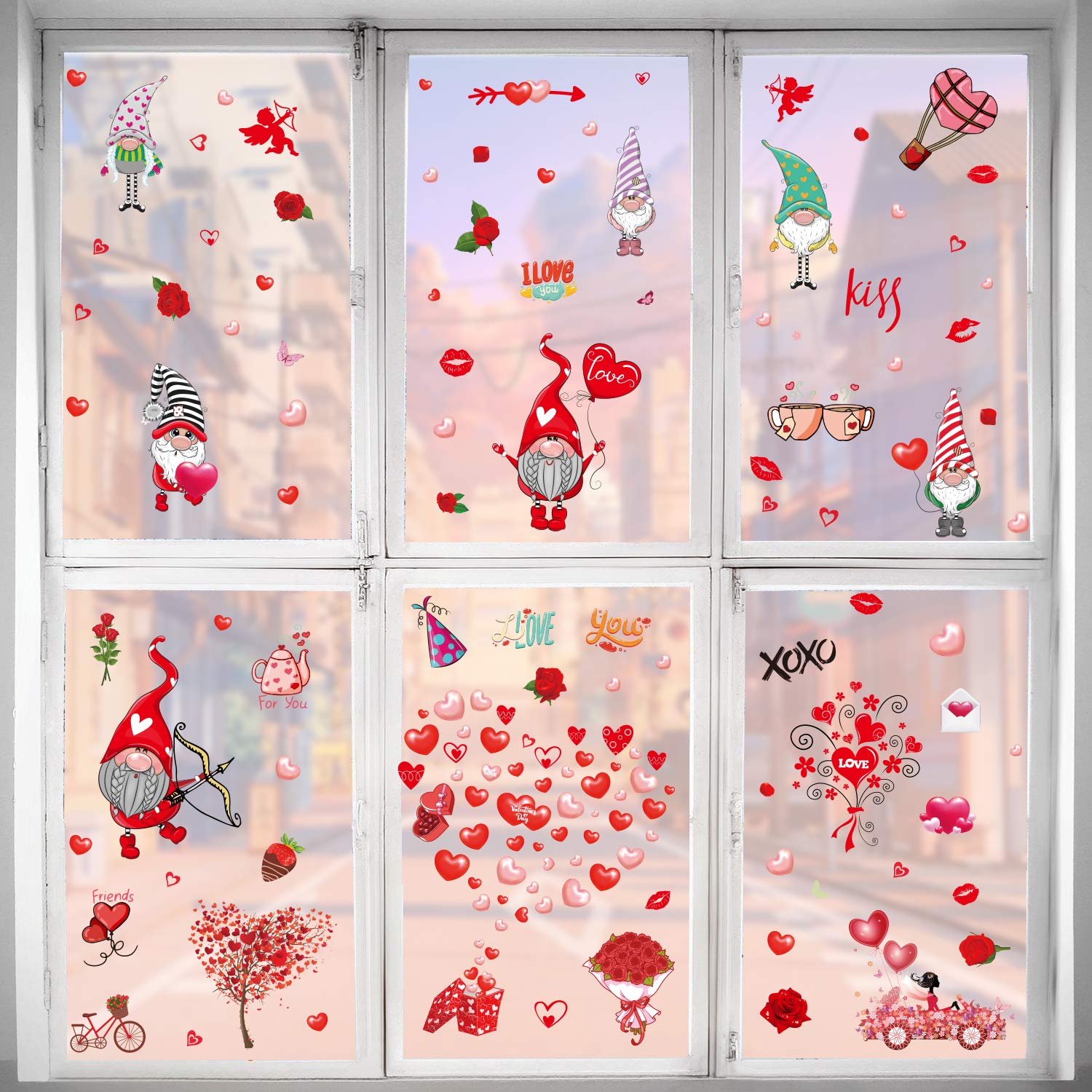 - Package included: these Valentine's Day window decals are included in 9 sheets. And these Valentine window clings with a lot of patterns, such as flower, heart love, cars, vehicles, heart trees, Gnome, heart balloons, etc. Enough quantity and different styles will meet your festival decorative demands, you can share these funny clings with your family and friends.