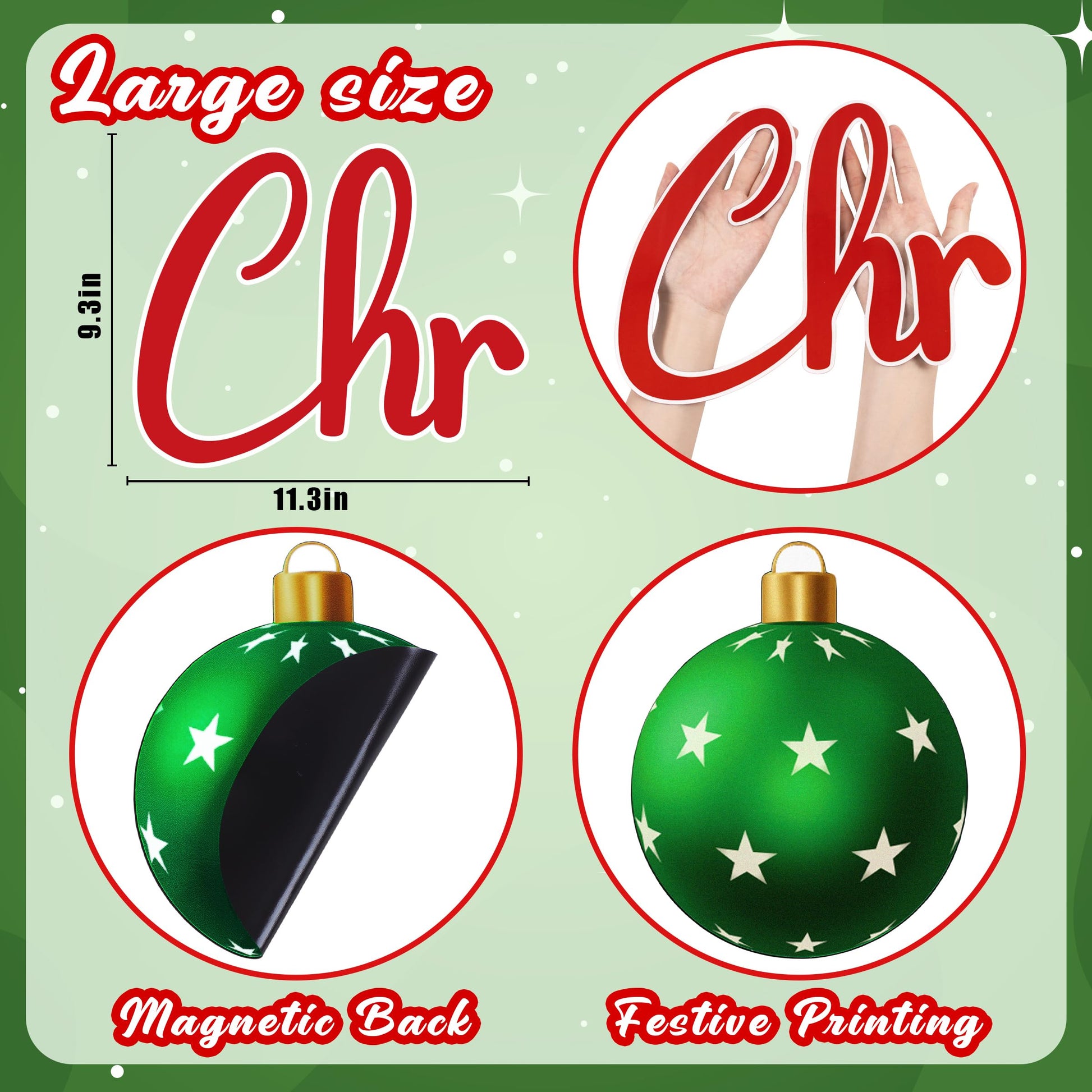 - Large size to visibly cover your garage door: Letter 'Chr' is 9.3'*11.3', letter 'm' magnet is 5.06”*5.1”. Christmas ball magnet is 6.5”*5.3”. Bow rope magnet is 5.9”*2.95”