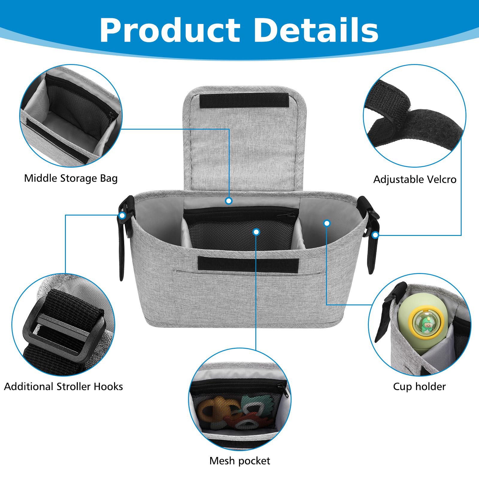- Multi structured Stroller Hanging Bag: This stroller bag has one cup holder each side; one net pocket with zipper; a large storage compartment in the middle. And one convenient phone pocket on the front.