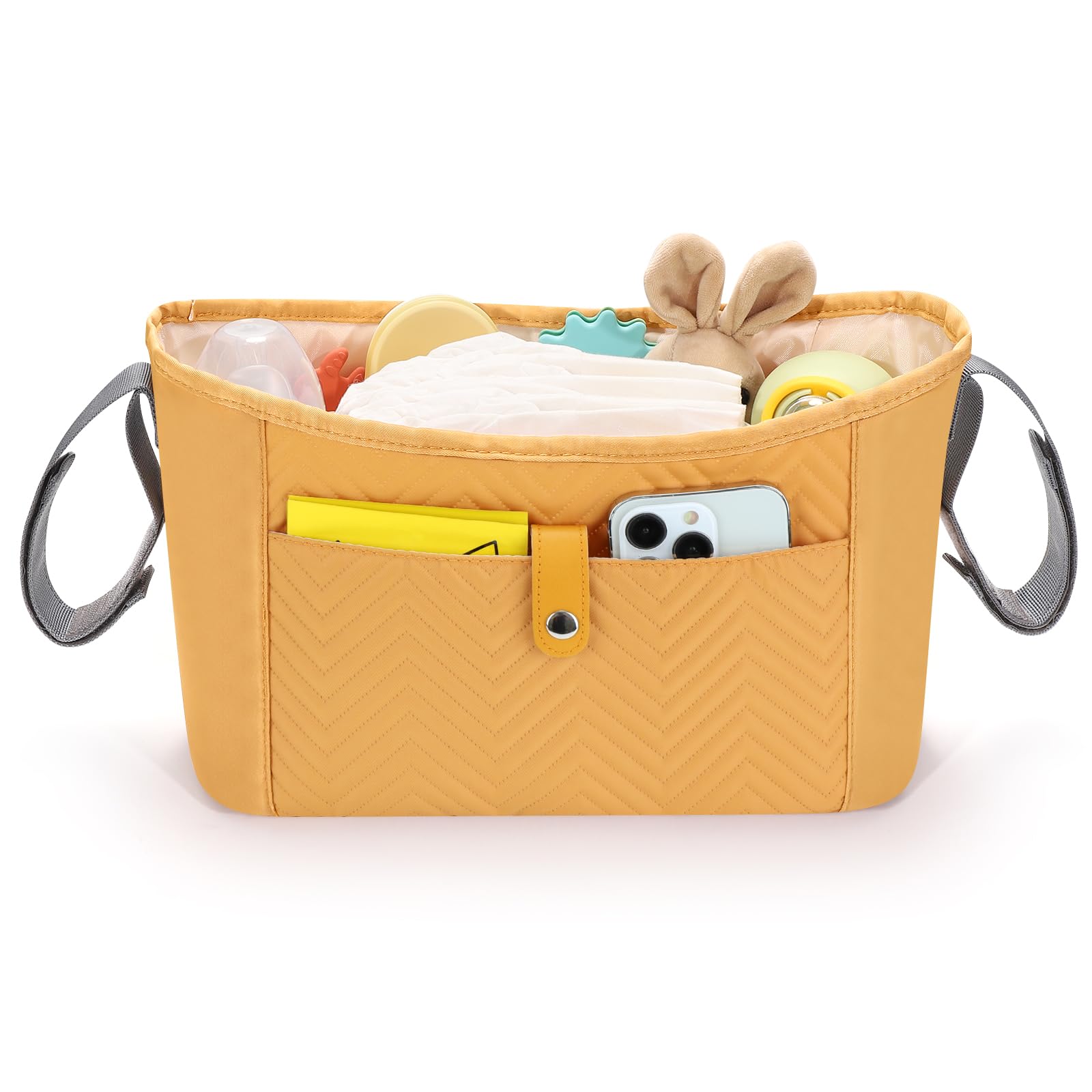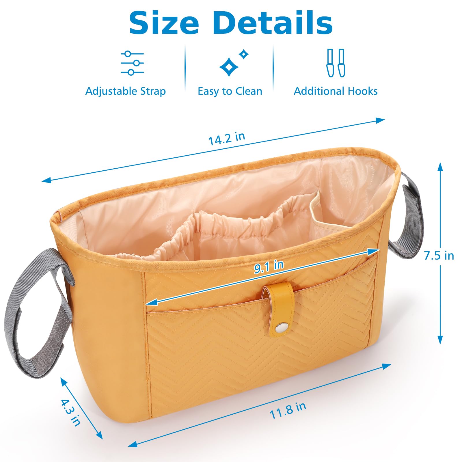 - Large Capacity: This stroller bag designed with 2 pockets to hold bottles; 4 pockets can be used to hold diapers and clothing; a large storage compartment in the middle. And one convenient pocket on the front. This stroller bag large enough to accommodate baby diapers, wipes, pacifiers, teething toys and other accessories.