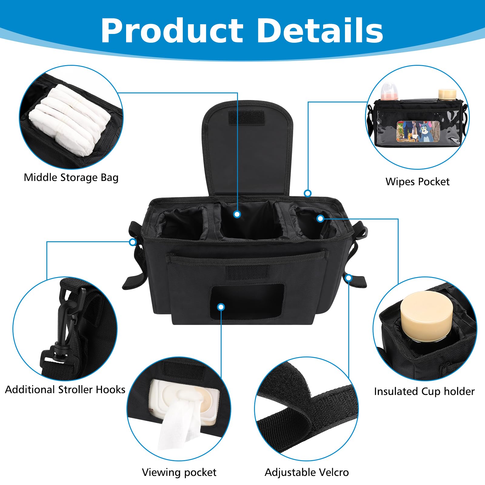 - Structured Stroller Organizer: This stroller caddy features an internal partition system that provides multifunctional compartments for efficient organization. The middle large storage compartment can storage baby diapers, toys, clothes, pacifiers or other accessories; 2 insulated cup holders on two sides, can be used to place baby bottles, beverage cups, water bottles etc. A convenient open pocket on the front for easy access to wet wipes or tissue.