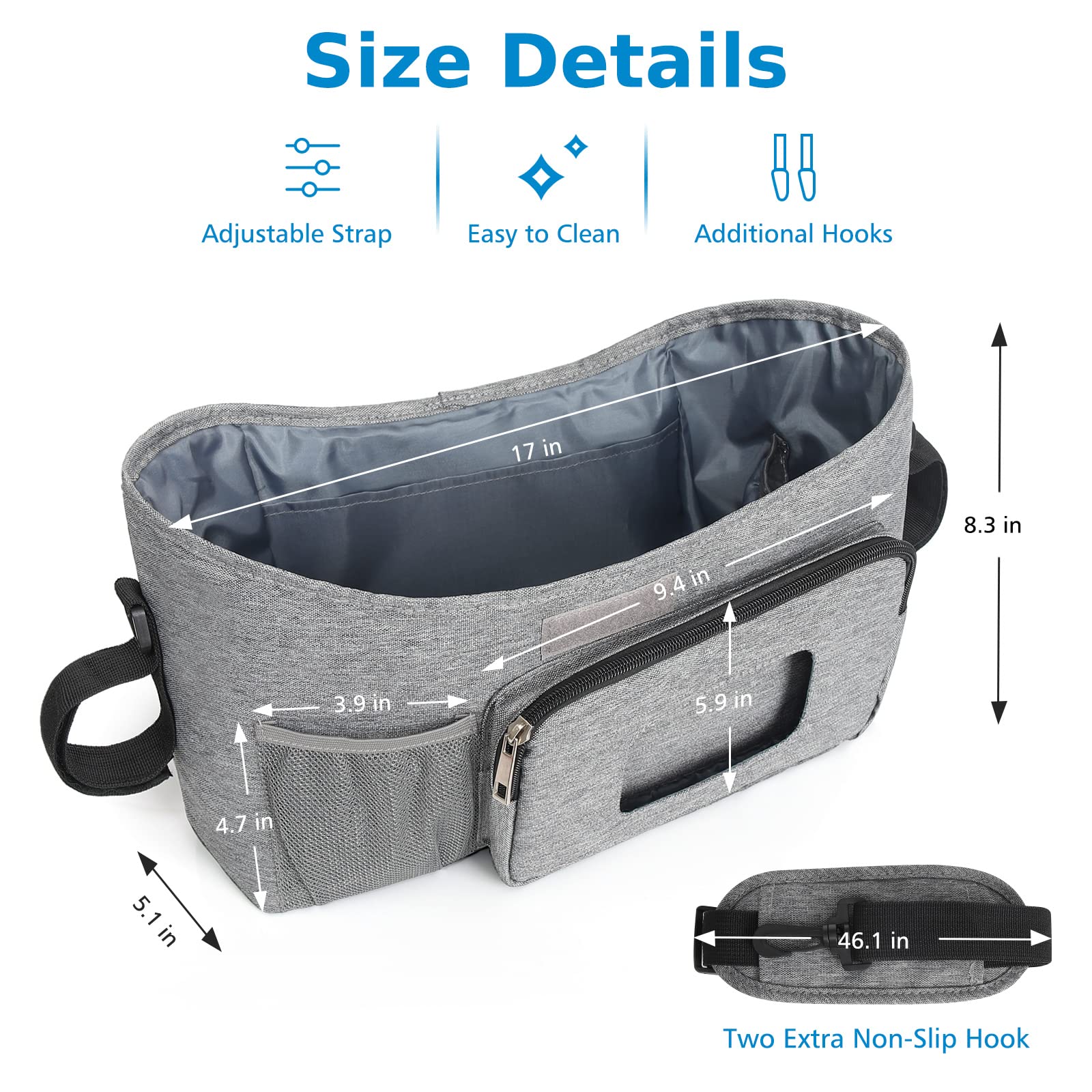 Accmor Universal Stroller Organizer with Insulated Cup Holder, Stroller Caddy Bag Accessories, Stroller Cup Holder Organizer for Uppababy Baby Jogger Britax Stroller, Grey
