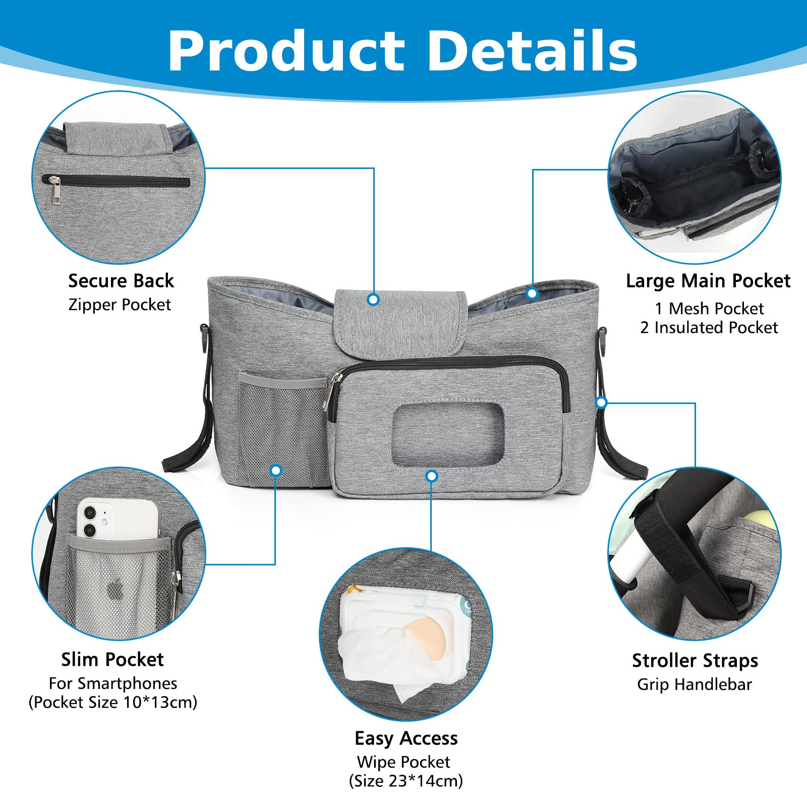 - Two Usage Methods : It can be hung as a stroller organizer on the stroller. When you don't need to use a stroller, you can also install the accompanying strap and carry this storage bag for easy outing.