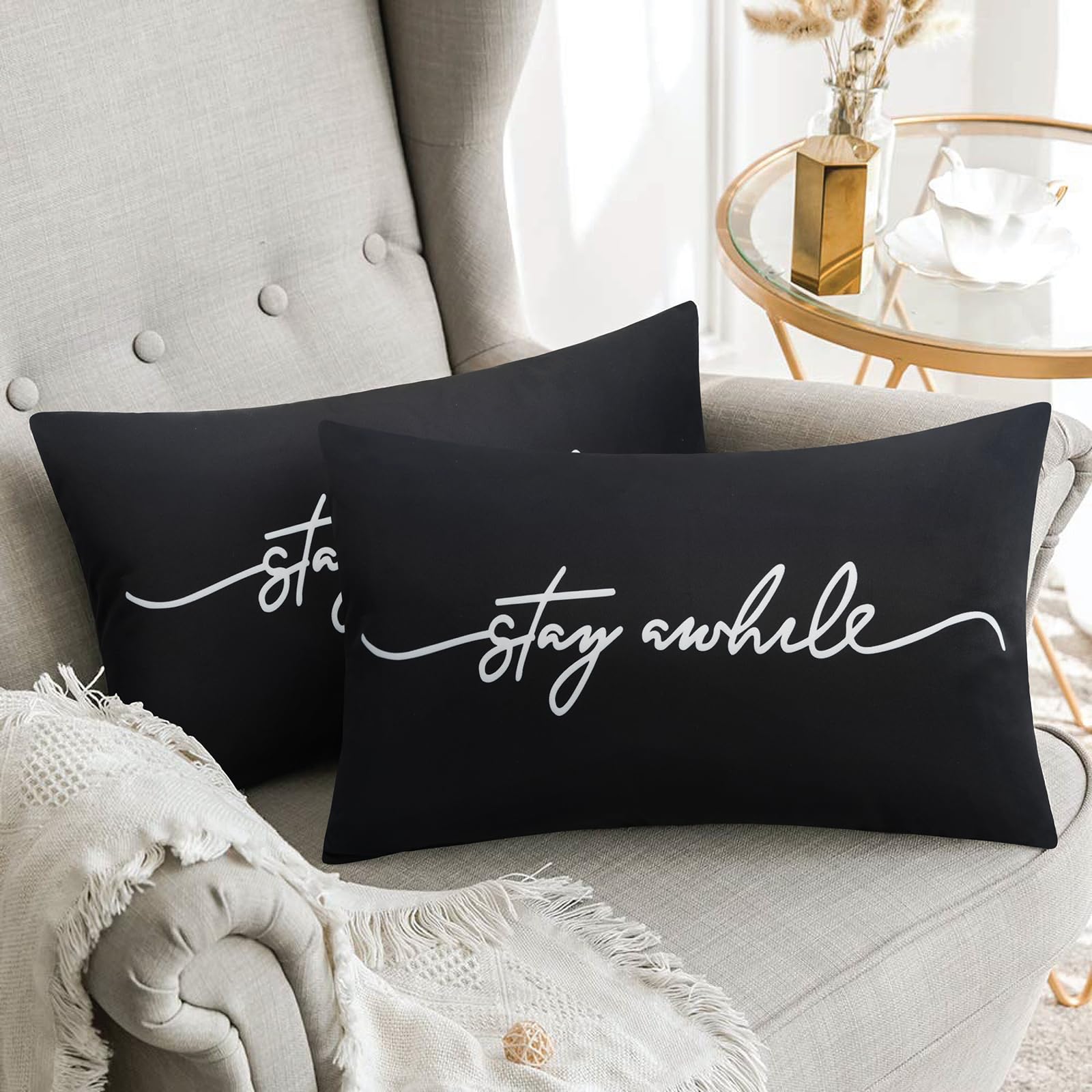 Adabana Outdoor Waterproof Throw Pillow Covers Set of 2 Stay awhile Decorative Outdoor Lumbar Pillows Cover for Patio Garden Porch Black 12x20 Inch
