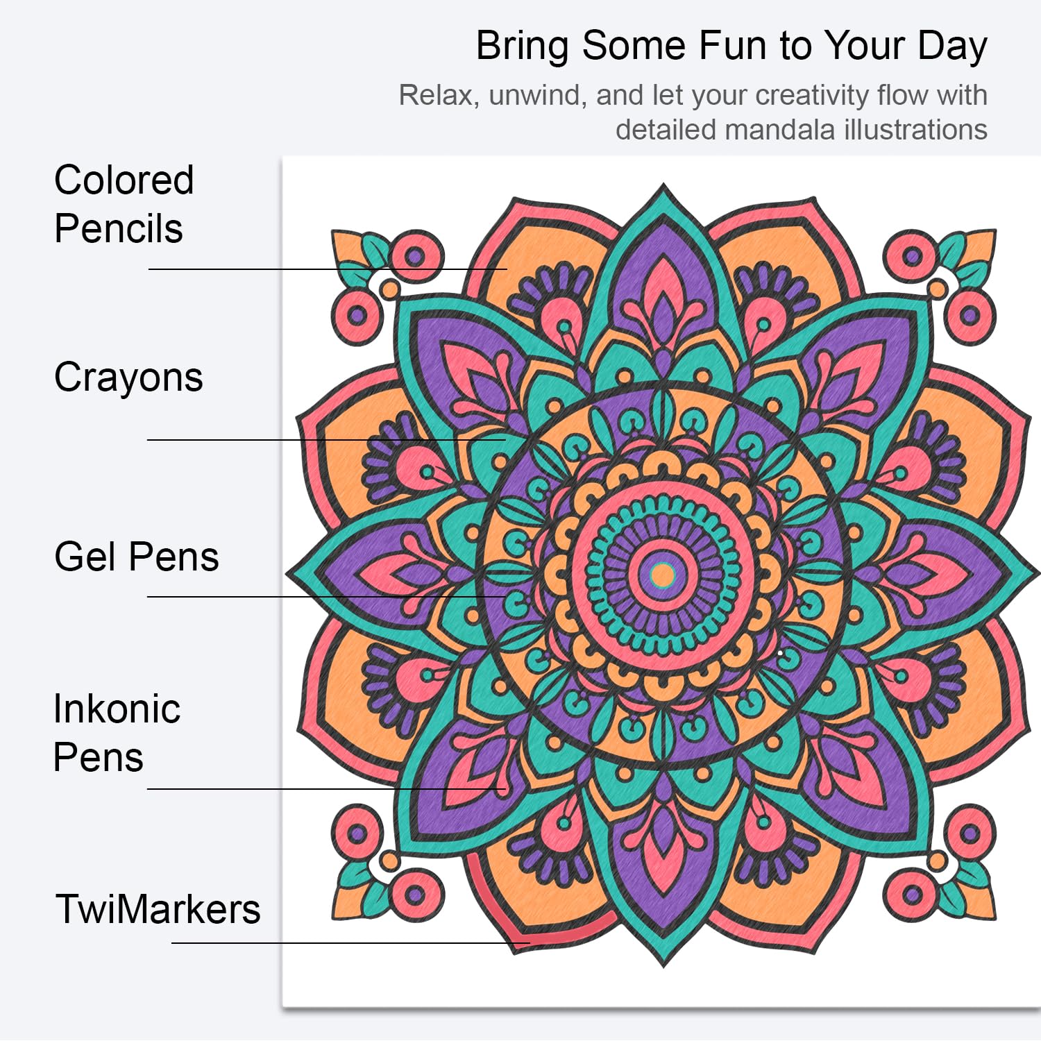 - Diverse Stress-Relieving Mandala Designs: Featuring 72 intricate and unique mandala patterns, these adult coloring books help reduce stress and anxiety. Our adult coloring books for women cater to those looking for a creative and relaxing activity. Each coloring book adults offers hours of enjoyment and tranquility. The coloring books adults are perfect for de-stressing and enhancing your artistic skills.