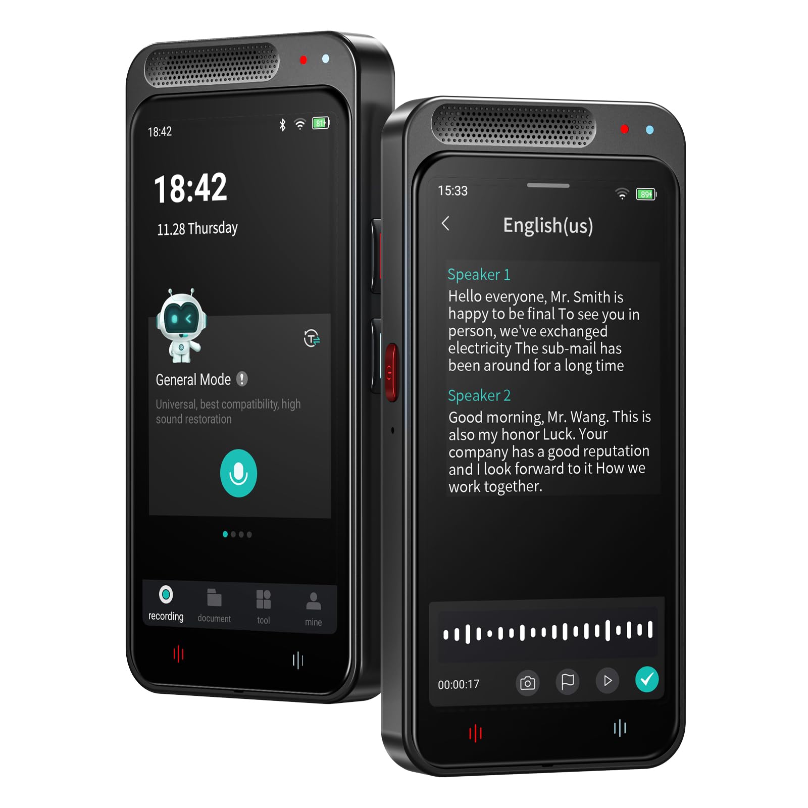 - 【Large HD Touch Screen】This voice recorder with playback features a 4.1-inch HD touch screen that supports intuitive operation, with functions covering history dialogue query, WLAN/Bluetooth connectivity, transcription settings, data encryption, operating as smoothly as a smartphone. In addition, voice to text recorder is equipped with a 1500mAh battery, 16GB of internal storage plus 64GB of expandable storage, and real-time preview of transcription content
