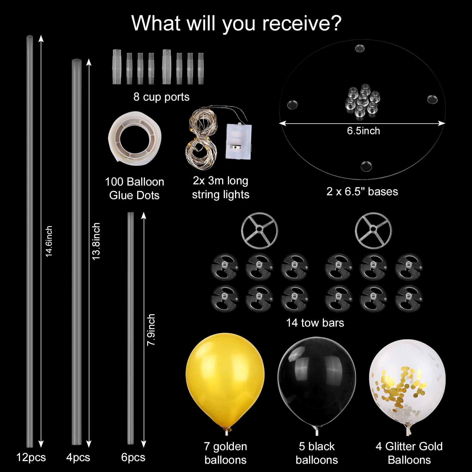 - Complete Balloon Stand Kit: Includes 2 sets of reusable balloon holders with 7 balloons each (total 14 balloons) and 2 string lights