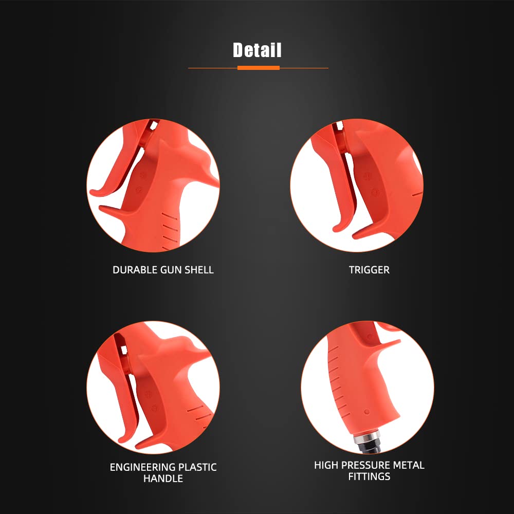 - 【User-friendly Design】: The handle and trigger are ergonomically designed according to the characteristics of the human hand, So that you won't be tired when working for a long time. In addition,the extended air spray gun can enter the inaccessible area. The hook design allows you to hang it on the wall when you don't need to use it, saving you time on placement.