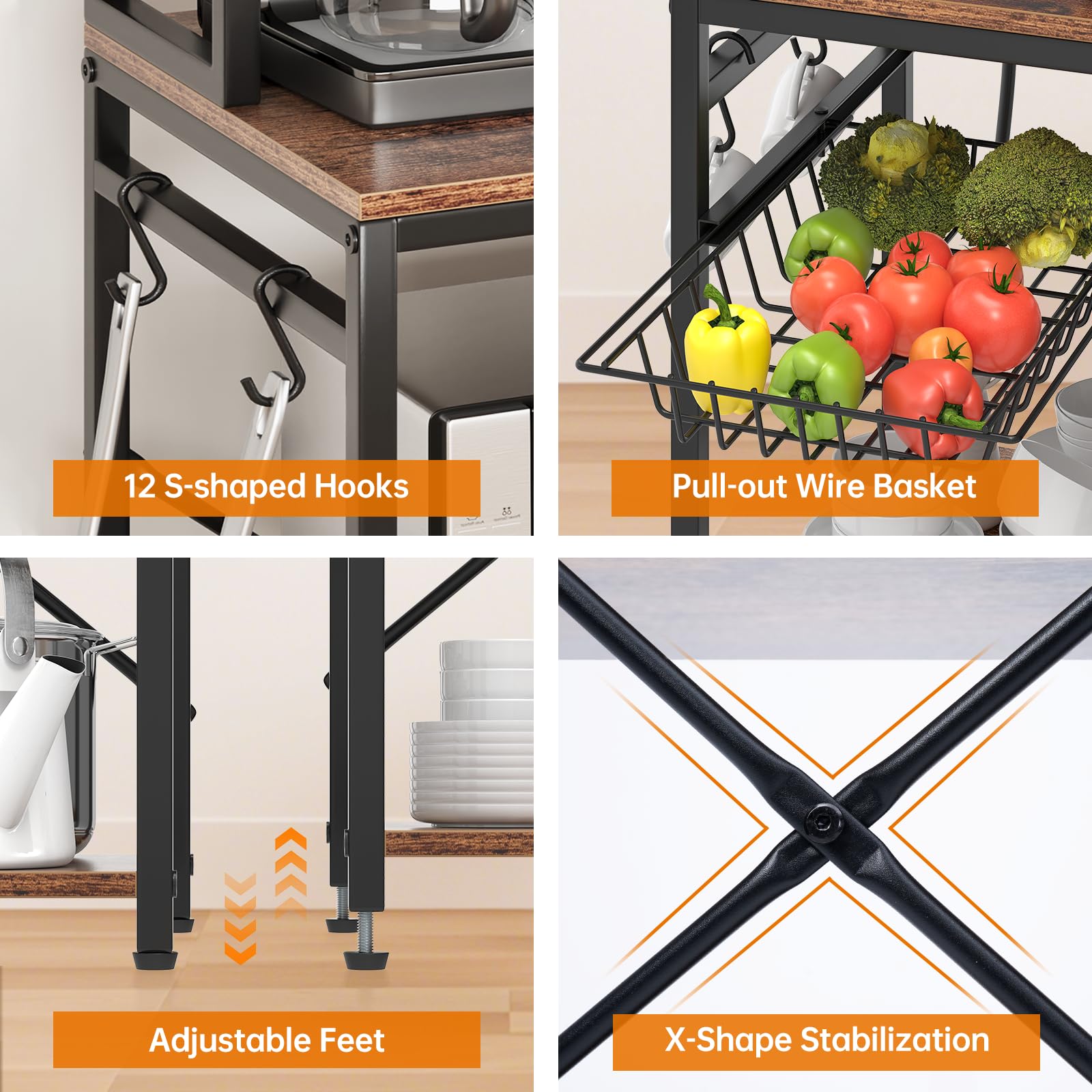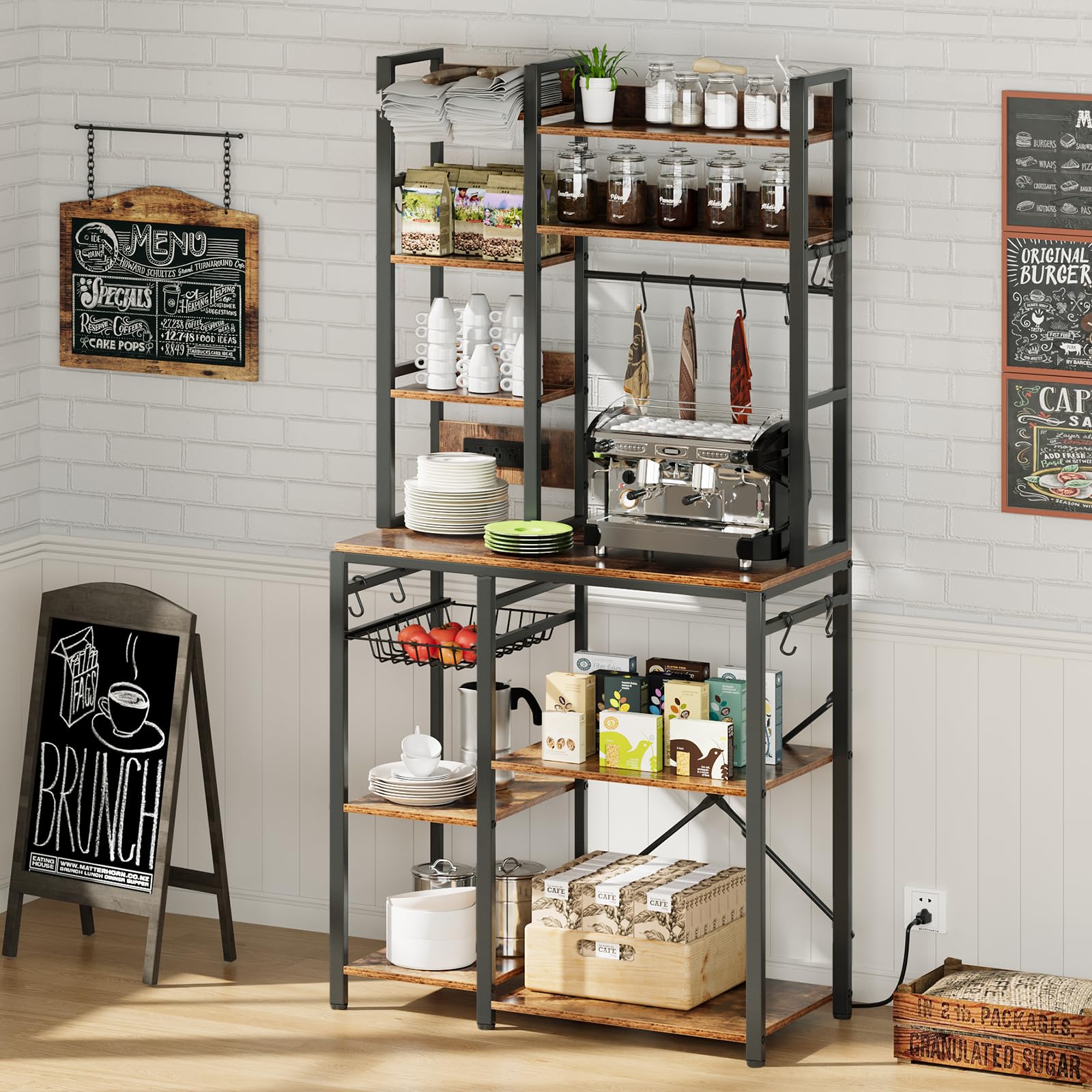 Airynee Bakers Rack with Power Outlet, 7-Tier Microwave Stand, Large Coffee Bar Stand with 12 Hooks & Wire Basket, Metal Kitchen Shelf Organizer for Pots, Spices, Easy Assembly, Rustic Brown