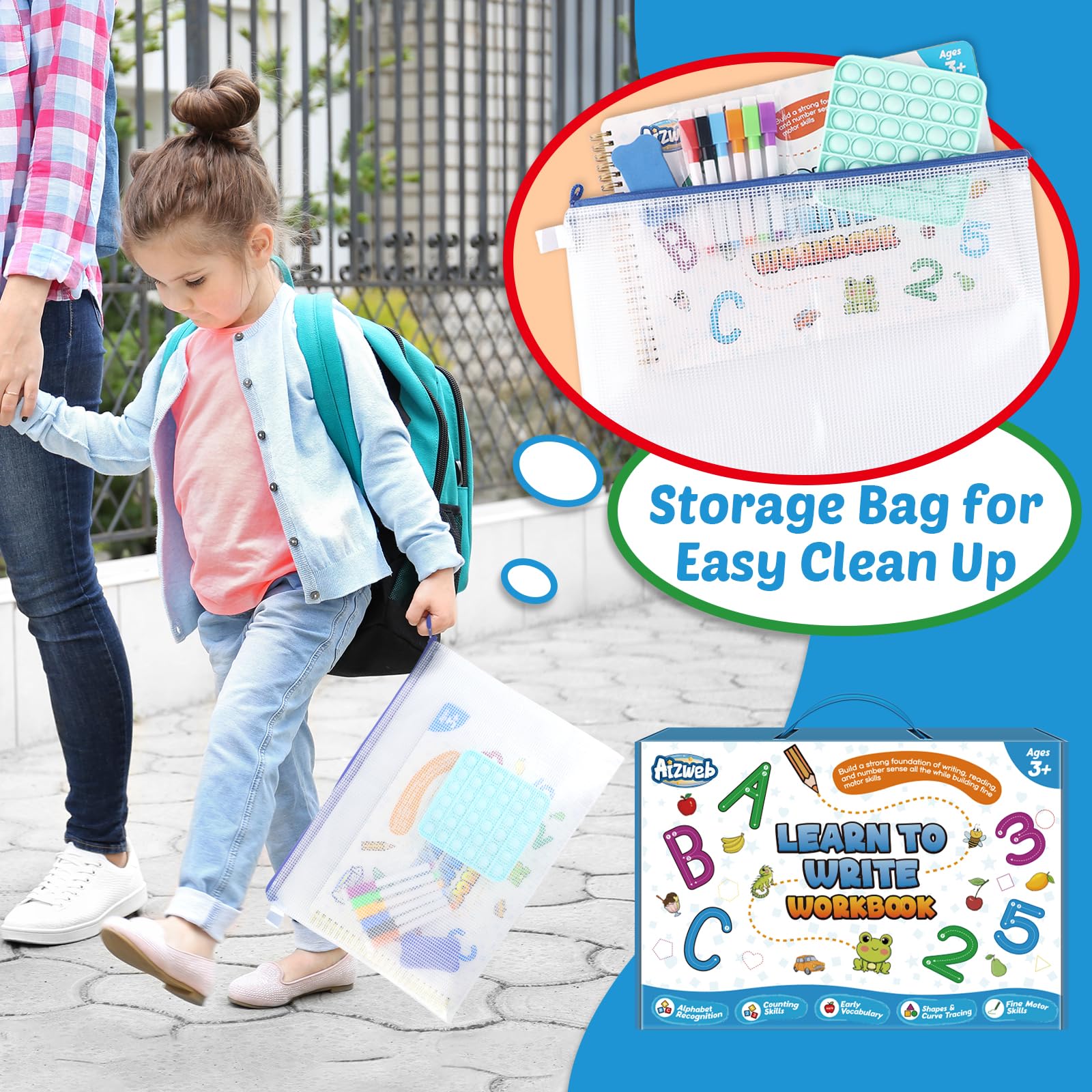 - 【Handwriting Practice for Kids】The writing book set comes in a value pack with 1 board, 1 storage bag, 1 practice workbook, 1 whiteboard eraser, 6 dry-erase makers, and 1 carrying case box with handle. Learn to write the alphabet and numbers the fun way with this big workbook of letter tracing for kids! All while they play and color in pages at their own pace!