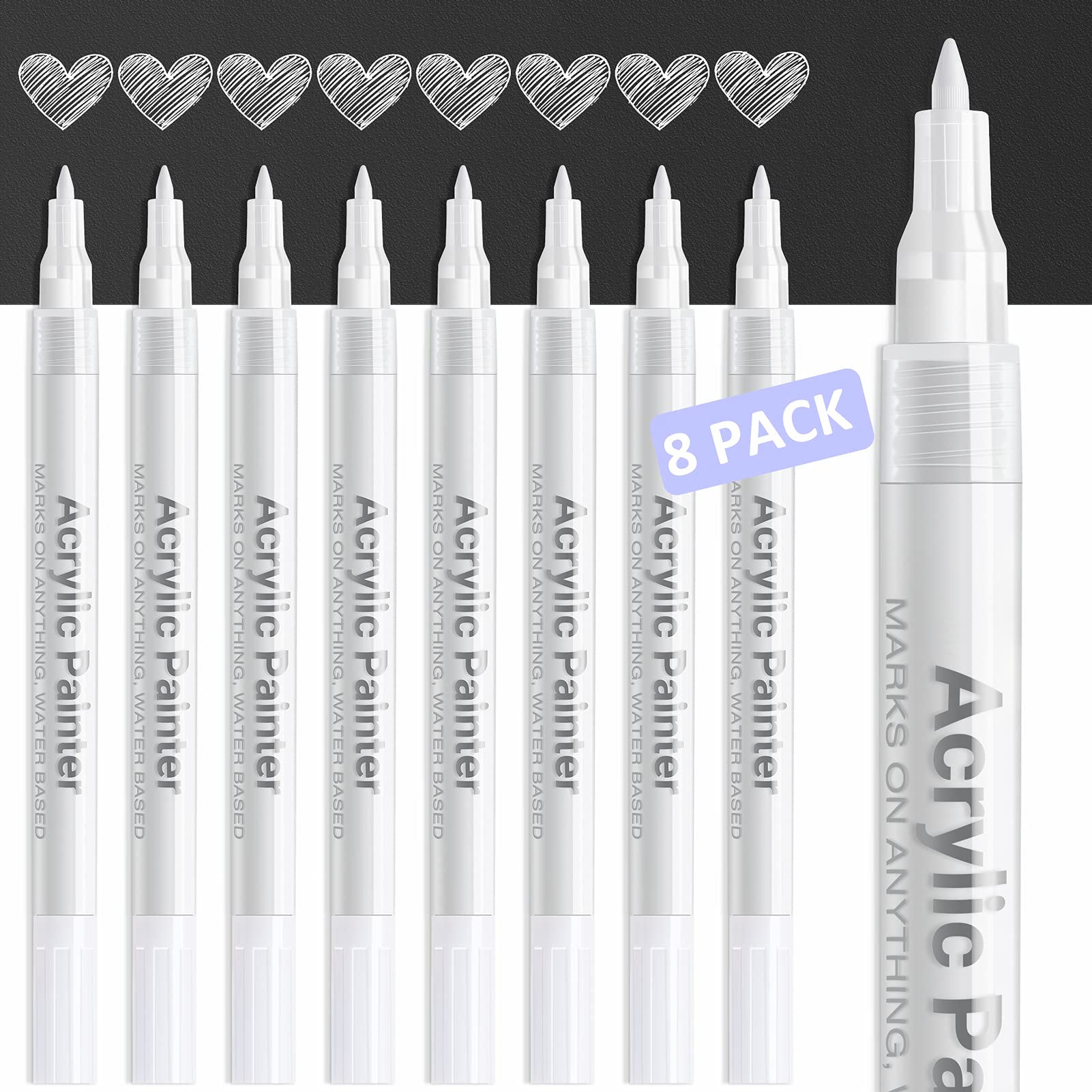 AKARUED White Paint Pen Acrylic Marker: 8 Pack 0.7mm White Paint Marker for Black Paper, Metal, Wood, Plastic, Ceramic, Metallic, Rock Painting, Drawing, Extra Fine Point, Ideal for Artist & Students
