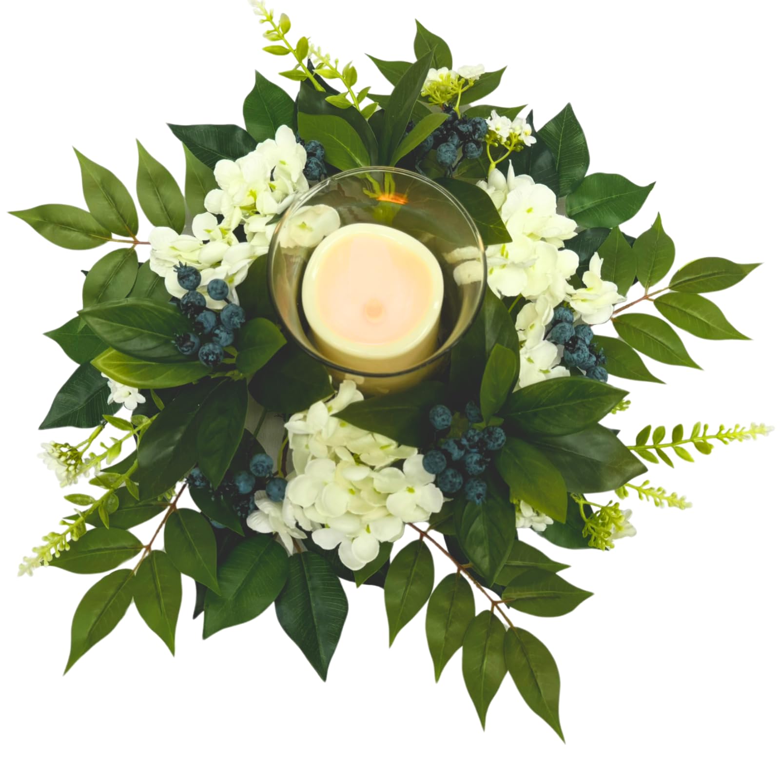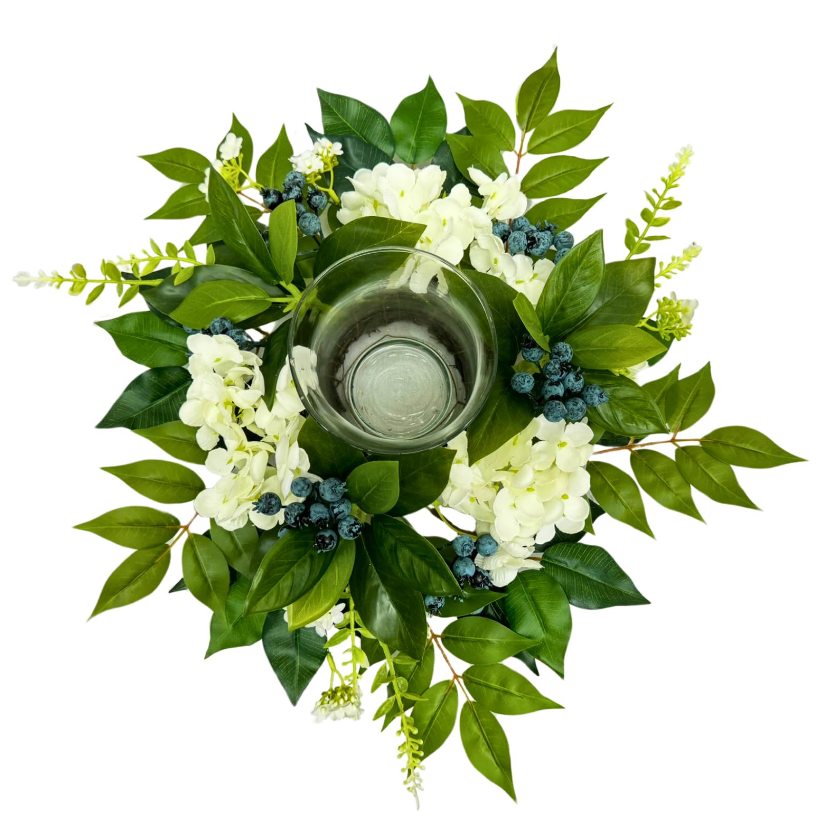 Details: Enhance your home or event décor with this Floral Glass Candle Holder Centerpiece, designed to blend natural elegance with functional versatility. Featuring lifelike artificial hydrangeas, blueberry stems, and eucalyptus leaves arranged around a clear glass candle holder, this piece transitions effortlessly from indoor dining tables to covered outdoor patios. Note: Candles are not included,pair with 3”W x 4”H flameless candles to complete the look.