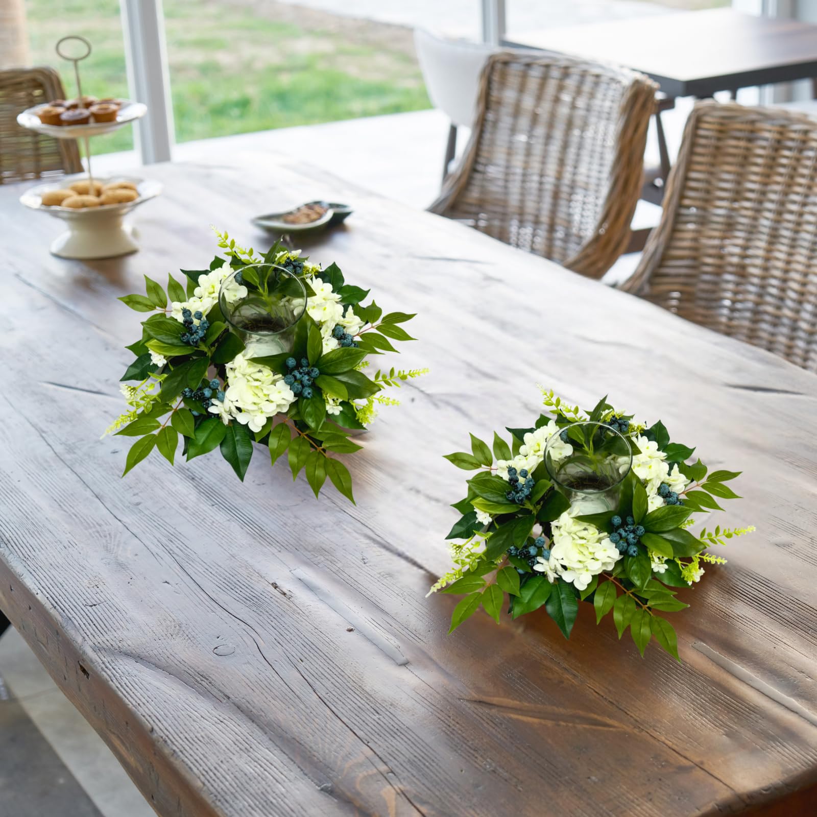 - Elegant Floral Centerpiece: Designed with artificial hydrangea flowers, blueberries, and eucalyptus leaves, this floral arrangement brings a natural and sophisticated charm to any space