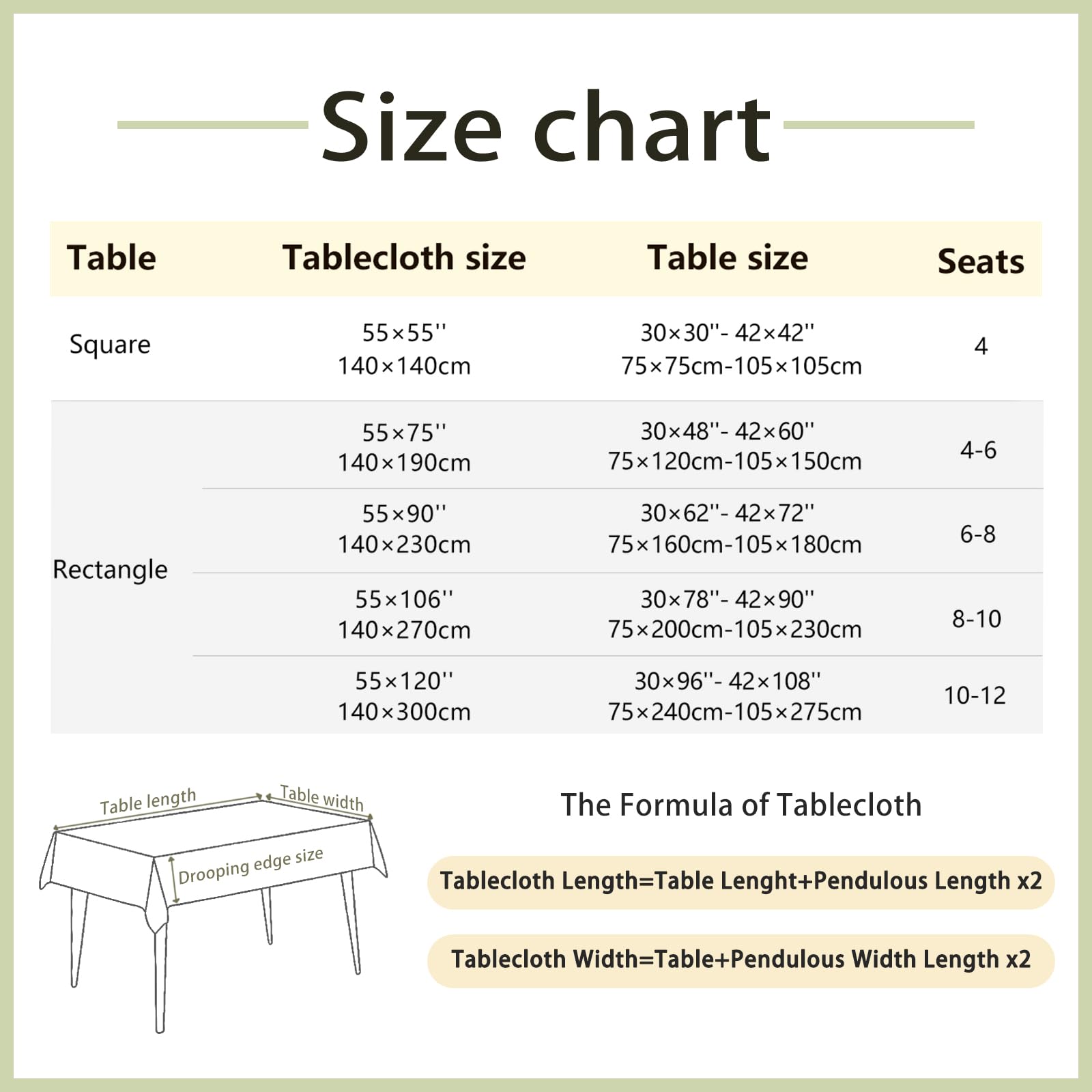 - 【SIZE GUIDE】Please measure the size of the table first, then refer to the size chart to choose the suitable tablecloths. It is recommended to increase the table length by more than 20 inches (10 inches on one side) to get a better drop effect