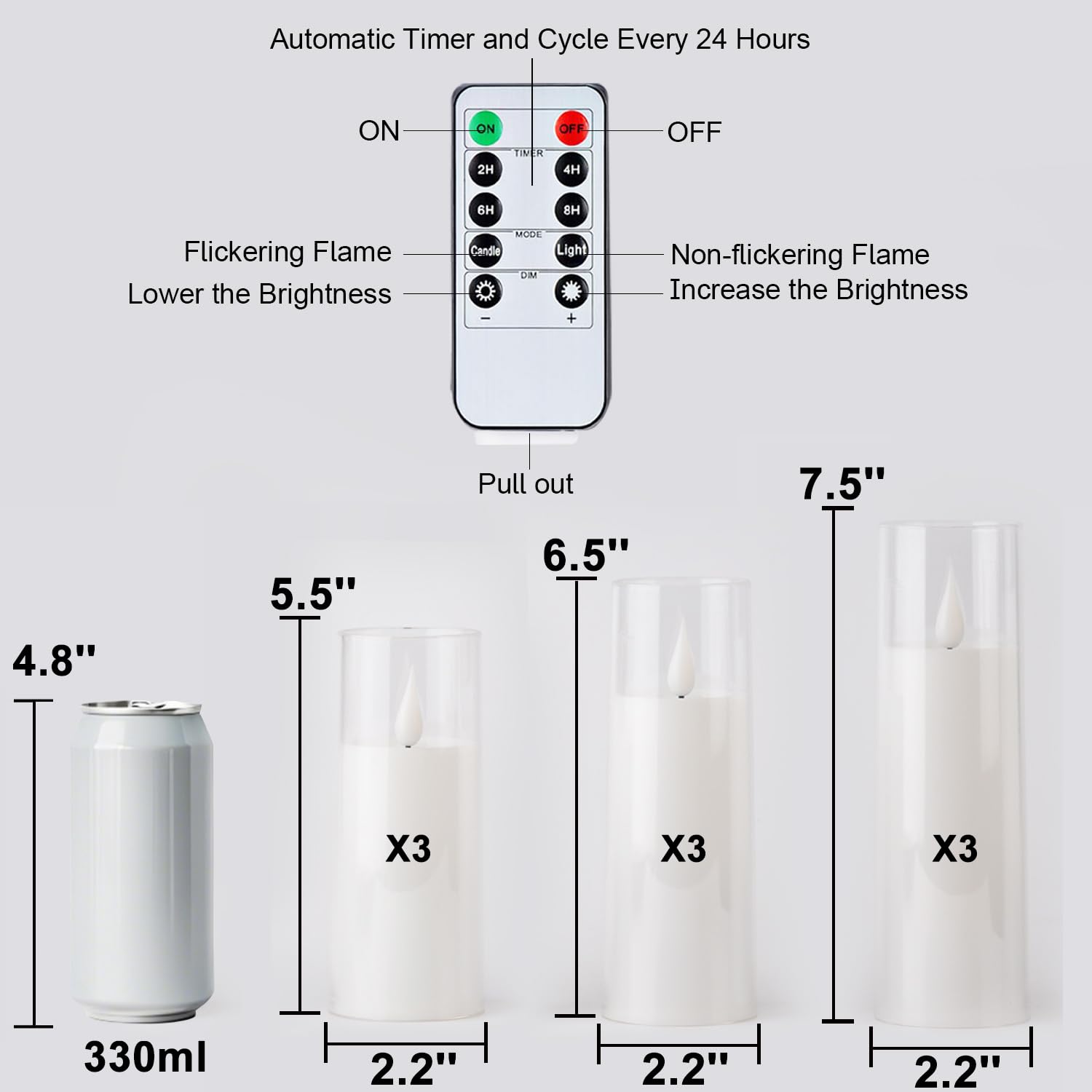 - Remote Control & Timer Function: The smart 10-key remote control makes the operation more convenient and flexible: adjust the brightness, the light modes and set the timer freely within 50 feet. Set a 2H/4H/6H/8H timers will save your trouble to turn the electric candles on/off because they will come back on automatically at the same time every day