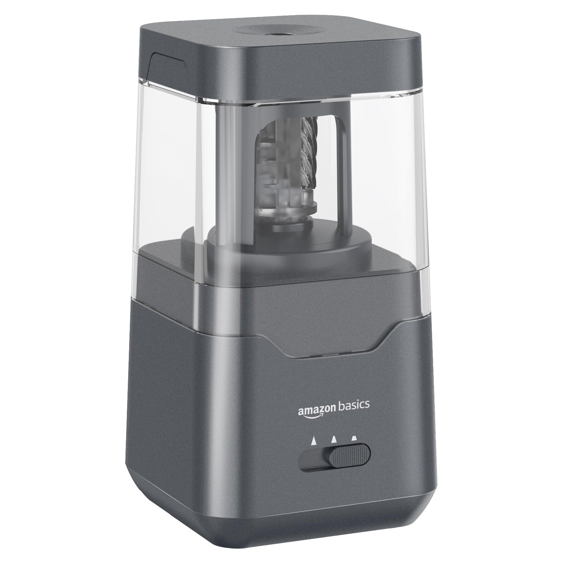 Amazon Basics Portable Electric Pencil Sharpener, Helical Blade, Auto Stop, Battery/USB Cord Operated, Black, 2.87 x 2.87 x 5.3 in