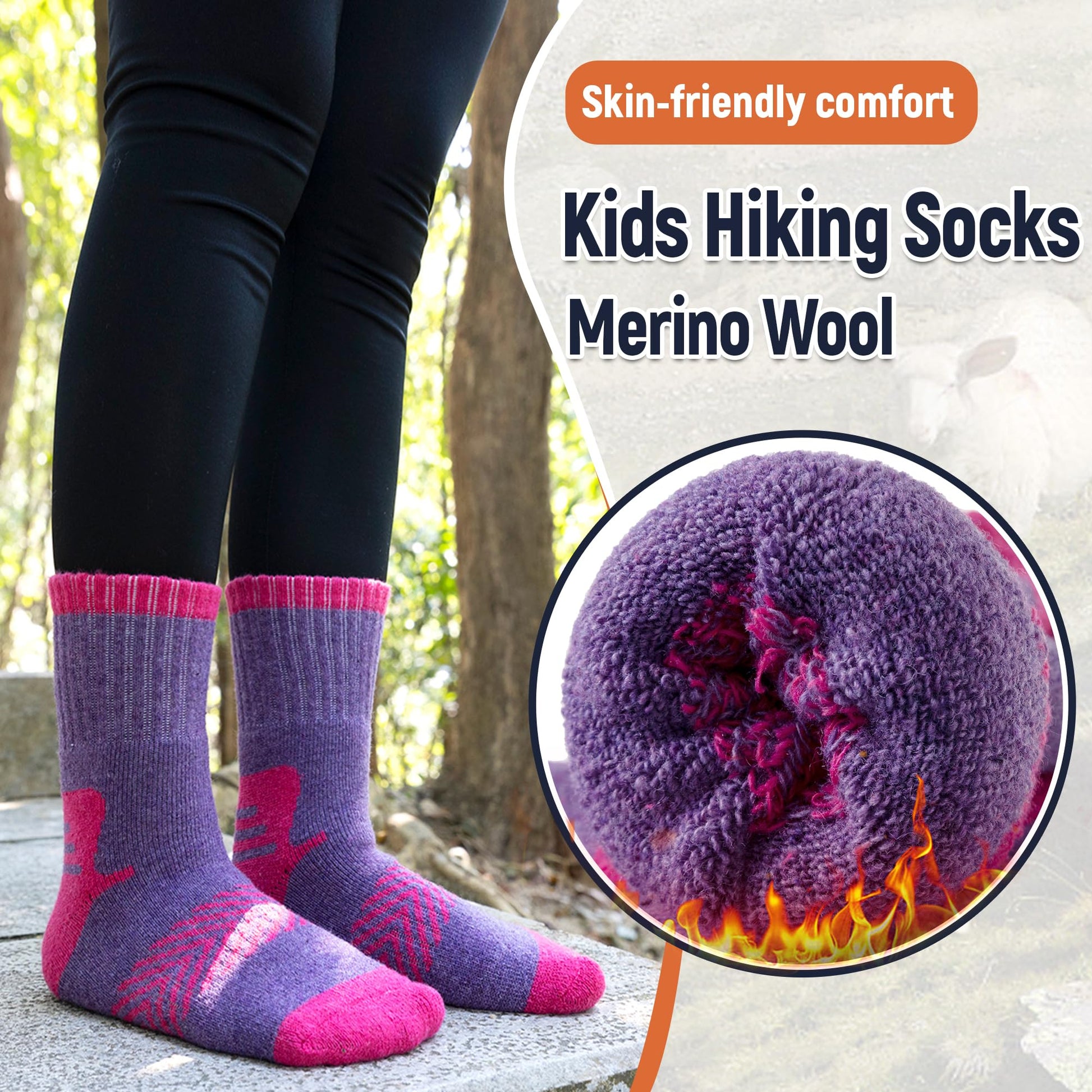 - SUITABLE FOR MANY OCCASIONS: Perfect for a variety of outdoor adventures, these kids' winter socks are ideal for camping, backpacking, and hiking. They're also great for everyday wear, pairing well with sneakers, shoes, or boots for a casual or sporty look. The socks are available in an array of colors, letting kids pick their favorite or match them to their hiking gear.
