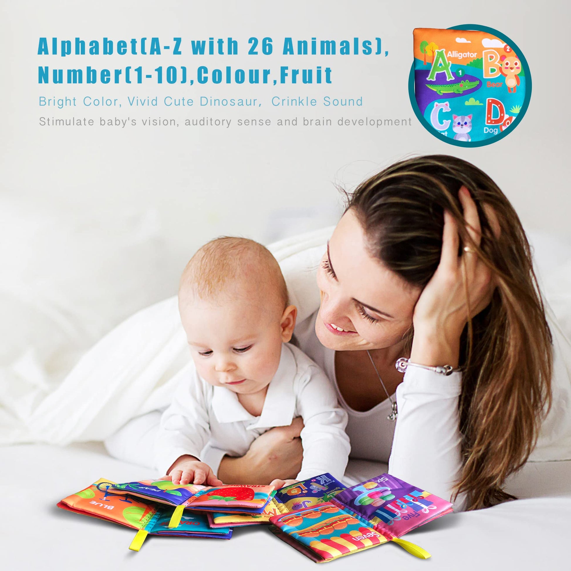AMINFUN Soft Cloth Baby Book Toy 0-6 Months, Baby Learning Book(ABC-Z,1-10,Colour,Fruit,4 Pack),Touch and Feel Crinkle Book Infants 6-18 Months,Early Educational Toy 0-3, Gift for Babies Infants