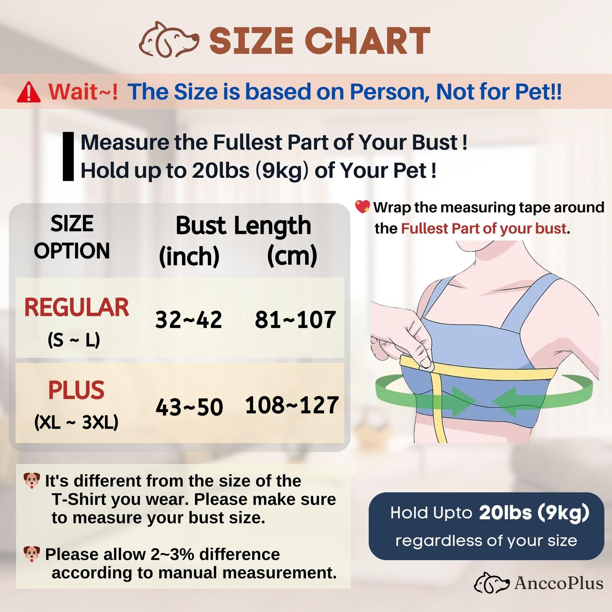 - [SIMPLE SIZE & PERFECT FIT] Please measure your fullest part of your bust and choose your size on the size chart. There are two simple sizes, Regular (S~L) and Plus (XL~3XL). Regardless of your size, our dog carrying sling is designed as small dog carrier up to 20lbs(9kg). The 95% Cotton is extra soft, and the 5% Spandex gives the elasticity which allows our dog sling carrier for small dogs to conform to your pet's shape, ensuring maximum comfort for both you and your pet during use