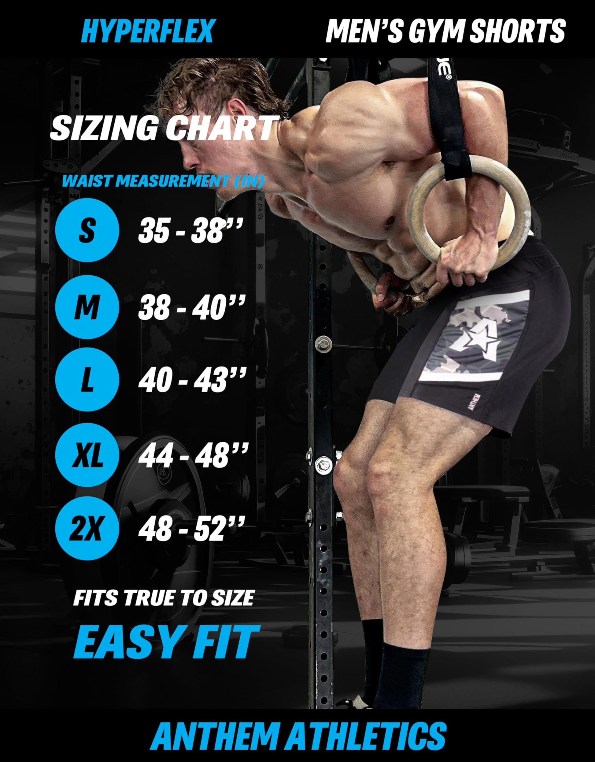 - GET THE RIGHT SIZE THE FIRST TIME (SEE SIZE CHART PIC). Our Workout Shorts men are made from a stretch performance fabric. While our athletic shorts men are designed to fit a range of body types, we recommend ordering one size down for a slimmer fit