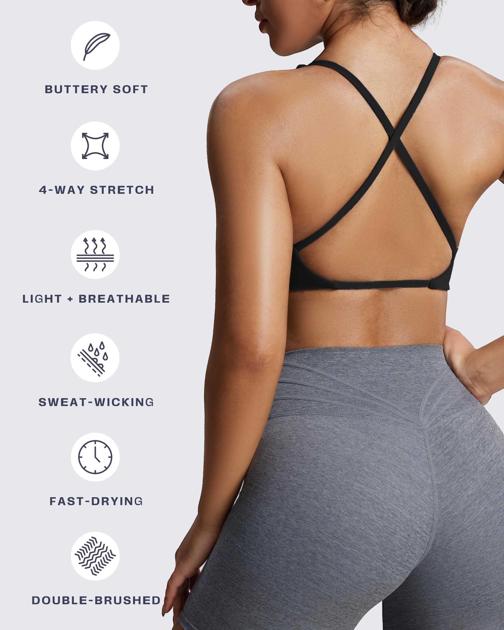 - The Sienna twist womens sports bra featuring thin crossed back straps and padding, despite small straps, it doesn’t bite into your traps and cause neck pain
