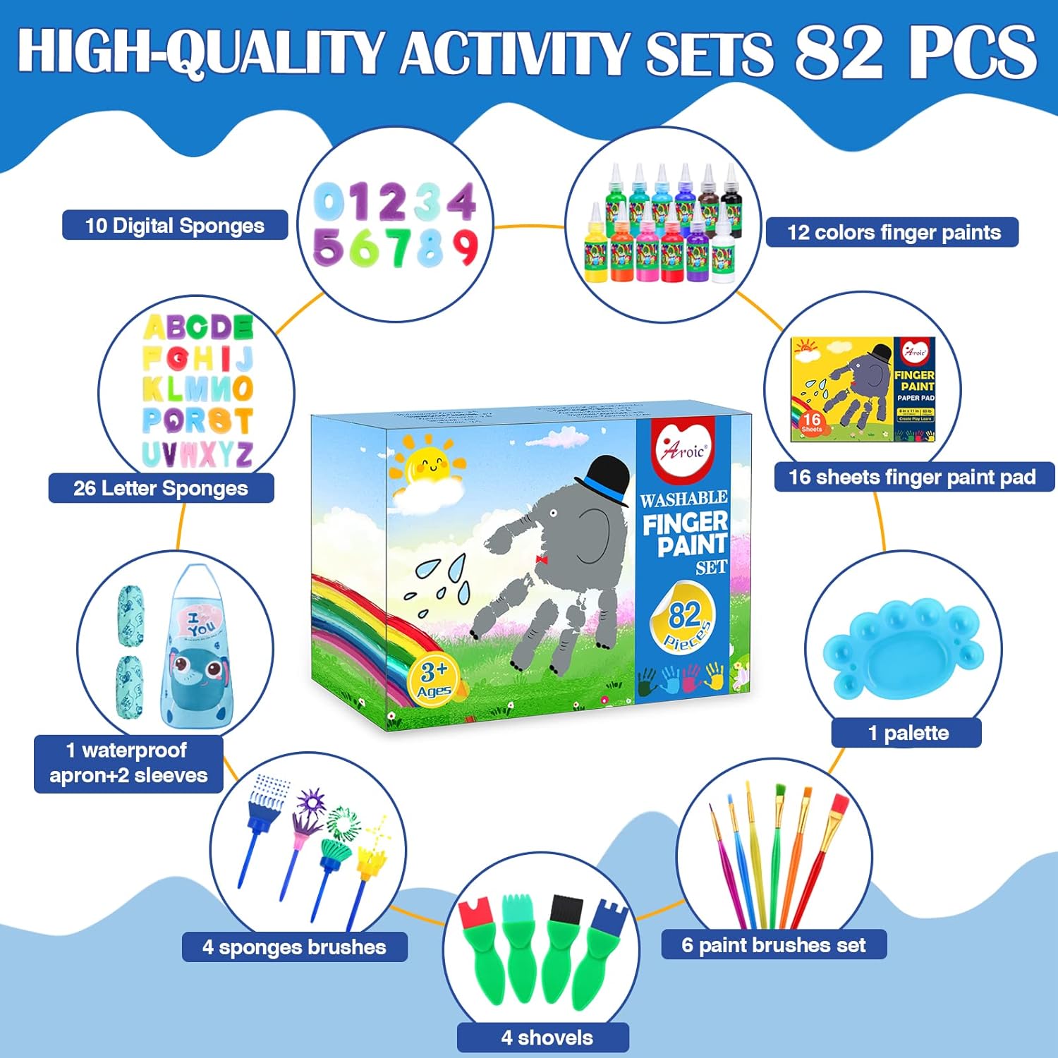 AROIC Washable Finger Paint Set, 82 Pack Washable Kids Paint Set with 12 Color Finger Paints, Sponges, Paint Brushes, Waterproof Paint Apron, Palette Paper for Toddler, Drawing Gifts Age 3+