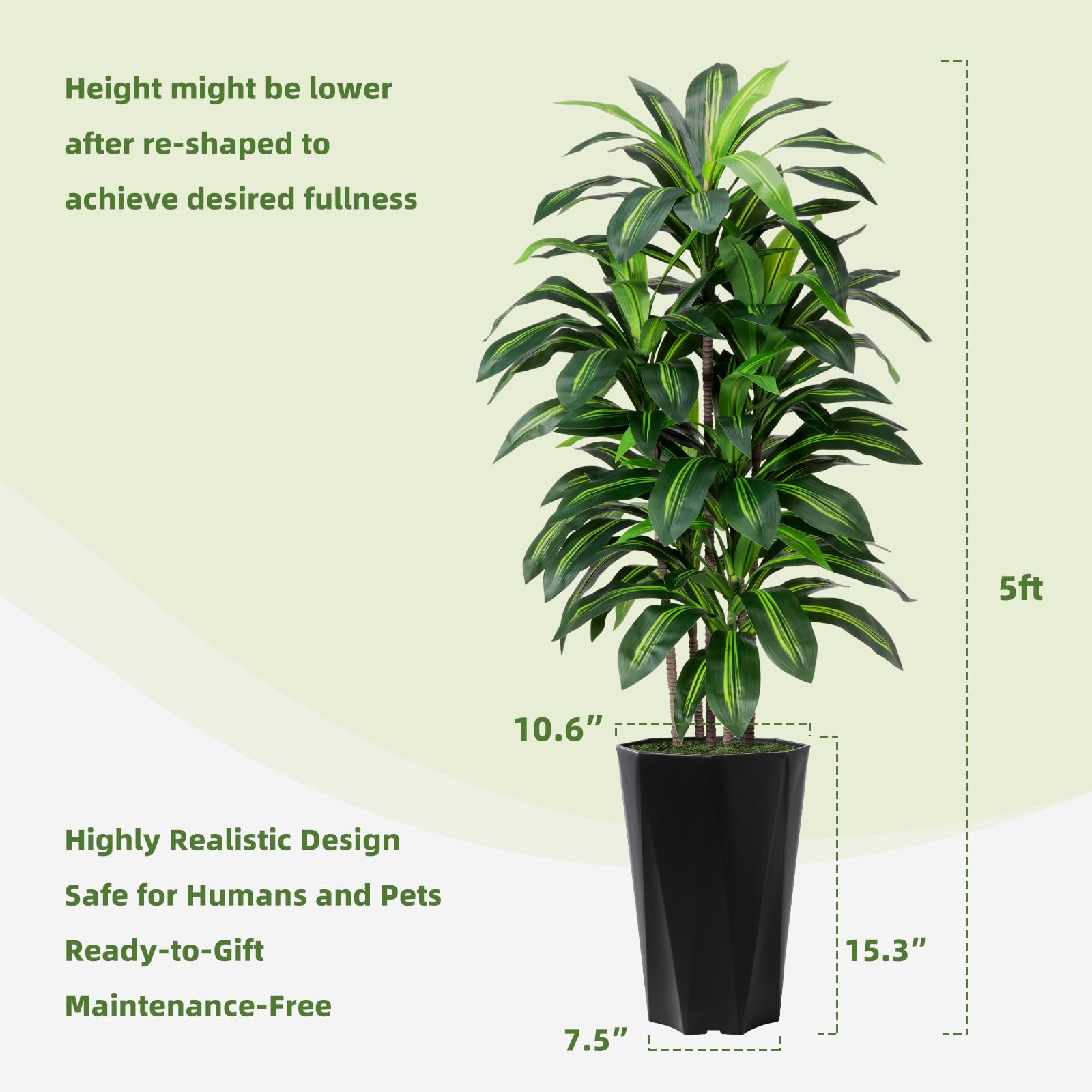 Artificial Dracaena Plant Indoor 5FT Fake Tree with White Diamond Planter Faux Yucca Tall Fake Floor Plant in Pot Artificial Trees for Home Office Living Room Decor Indoor
