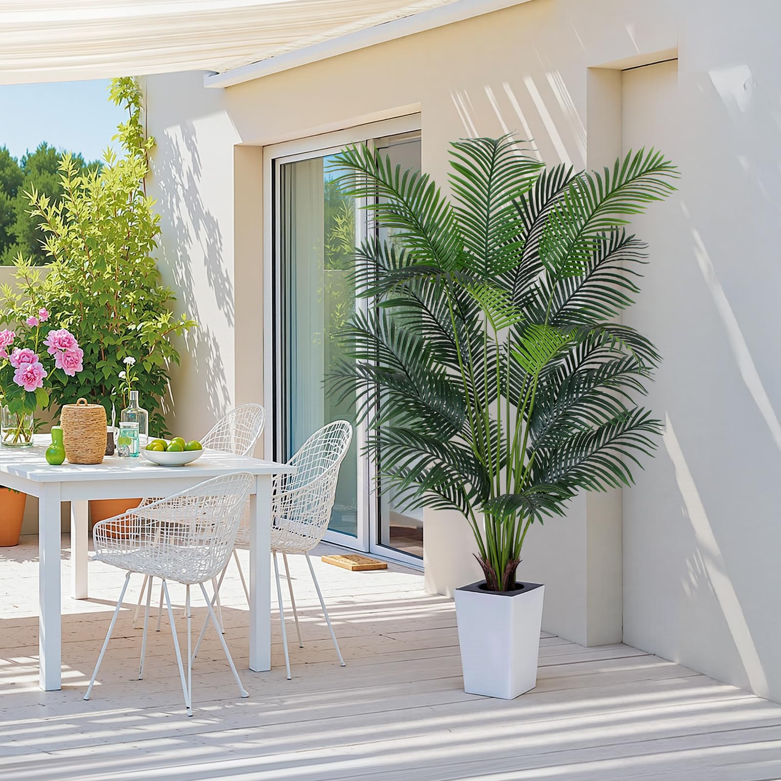 - 【Indoor&Outdoor Decor】Standing 7ft tall from the pot bottom to the top leaves, this large floor house plant is a perfect room decor piece. No matter it’s for indoor or outdoor decor, this fake palm tree will creates a finishing touch to any places. Please keep it under shelter if it’s for outdoor use, direct sunlight or rain washing may cause color fading. It’s a perfect gift choice for friends or families on important occasions, like Parties, Housewarming, Birthdays, Ceremonies, Weddings,etc.