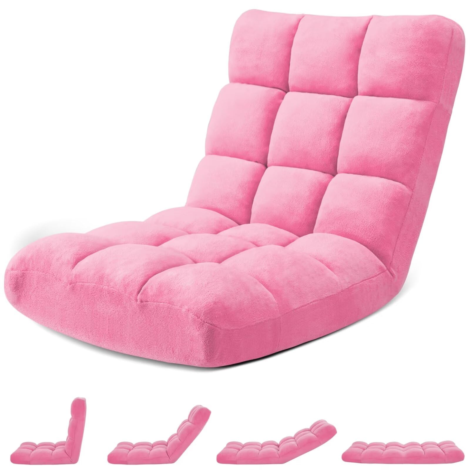 Avocahom Folding Floor Gaming Chair 14-Poistion Cushioned Adjustable Floor Lazy Sofa Chair w/Breathable Cotton & Skin-Friendly Coral Velve for Adults & Kids Perfect for Reading Gaming Meditating, Pink