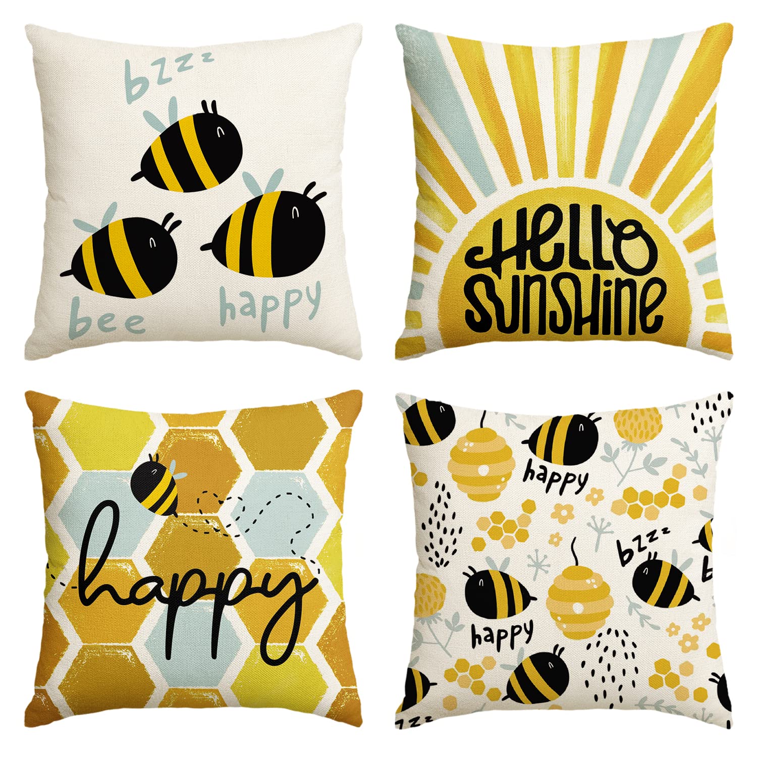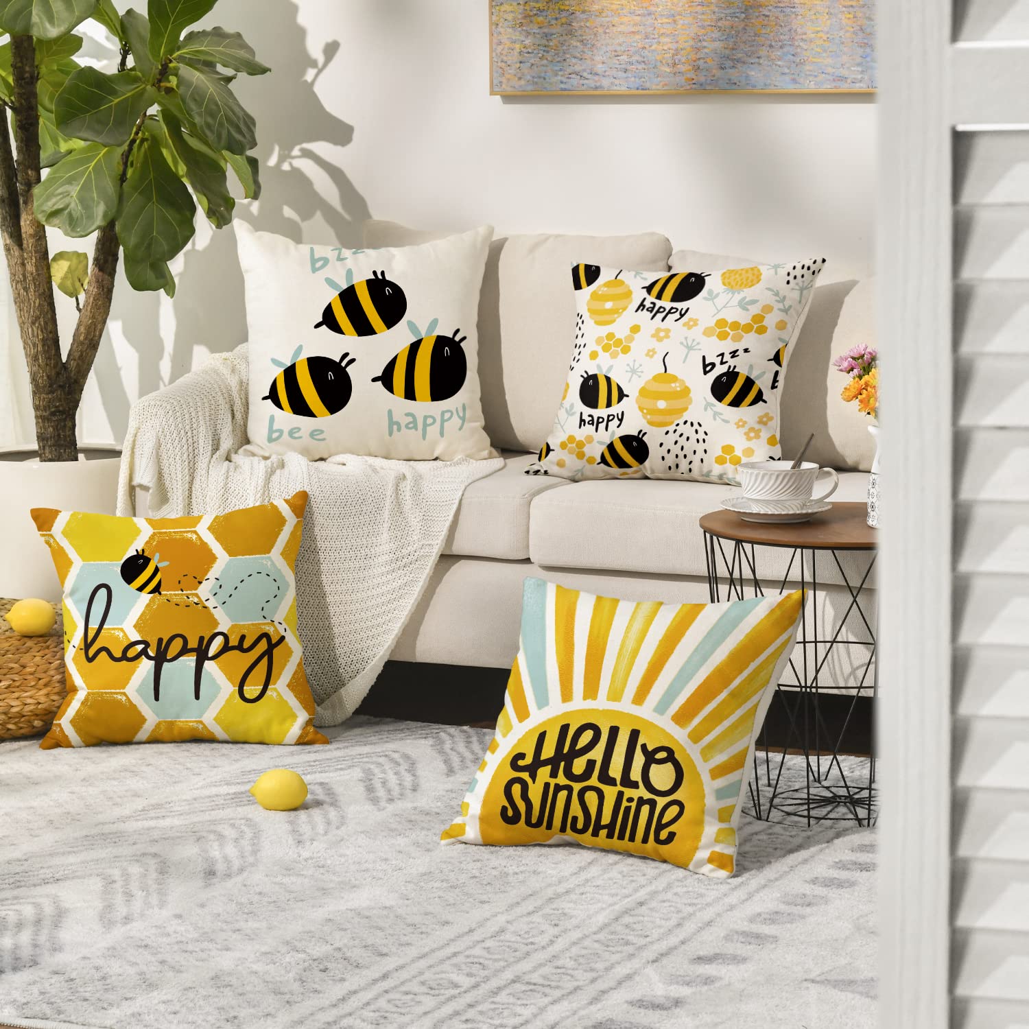 AVOIN colorlife Bee Happy Hello Sunshine Throw Pillow Covers, 18 x 18 Inch Honeycomb Sunshine Summer Cushion Case for Sofa Couch Set of 4