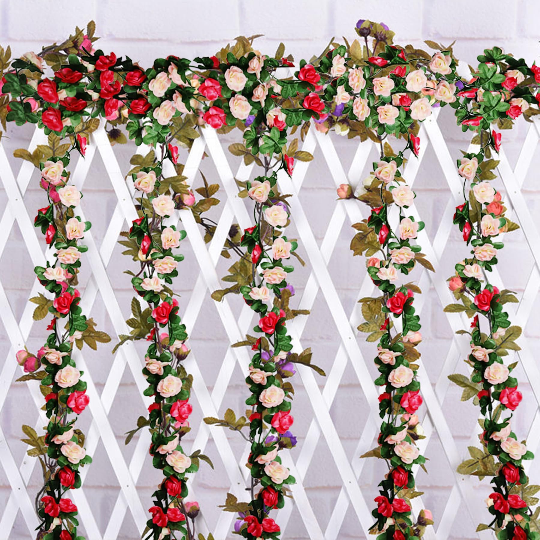 - Flower Garland Size: Rose garland pack of 5, each strip has 45 flowers and 45 green leaves, the vine is 8.2 feet long. Flower head diameter 1 inch, green leaves size 1*0.5 inch.5 rose vines connected together length up to 41 feet, fuller winding.