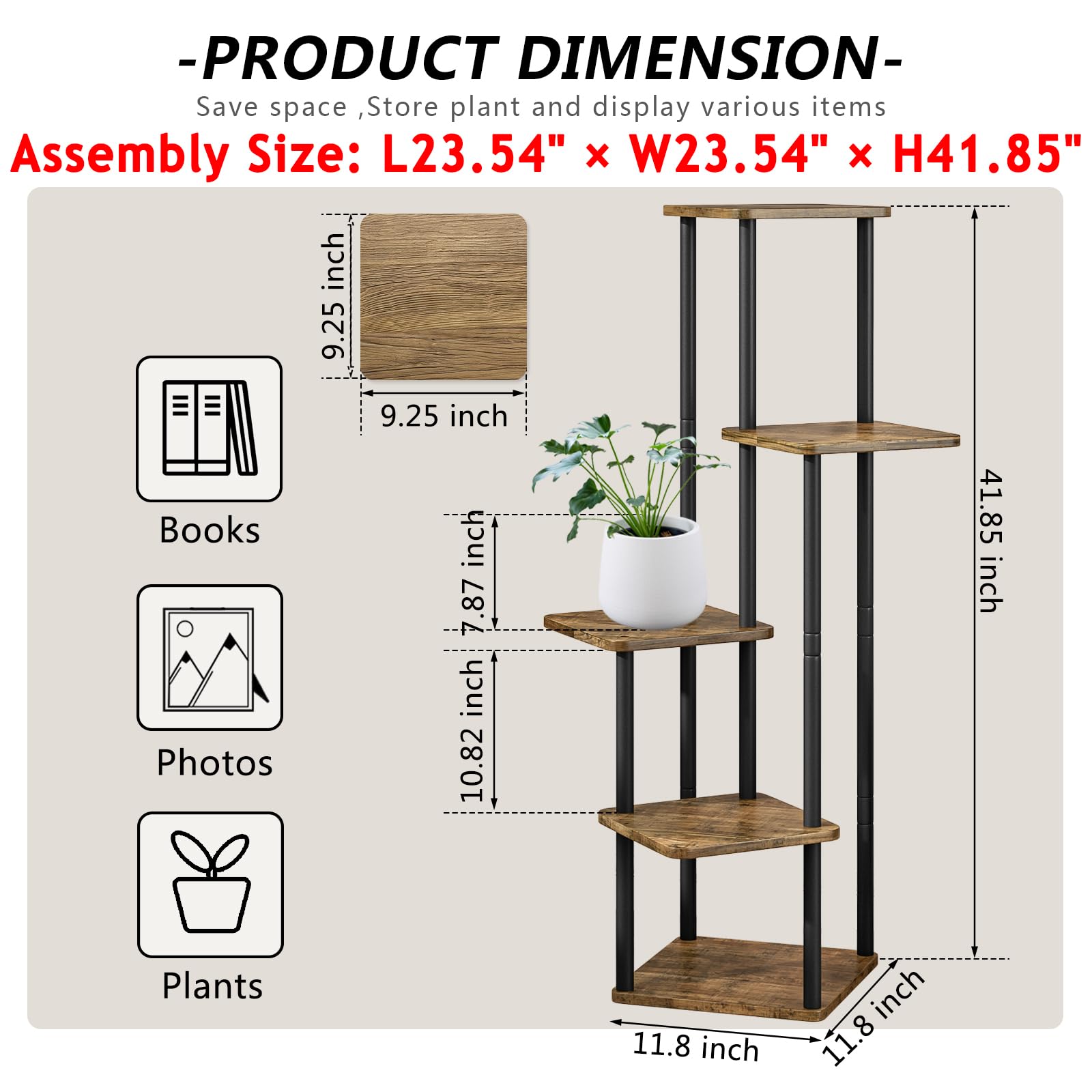 - 【5 Tier Tall Plant Shelf】The Indoor Plant Stand includes 5 shelves, 23.54(L) x 23.54(W) x 41.85(H) inches,perfect for flower pots of various sizes and shapes, each plant can soak up sufficient sunlight to thrive. In addition to showcasing your lovely plant, you can also use it for your pictures or memorable knickknacks.