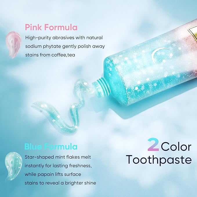 - Daily Care Choice: Dual-Color Toothpaste Infused with natural extracts of sodium phytate and papain, ideal for daily effective care, dissolving stains.