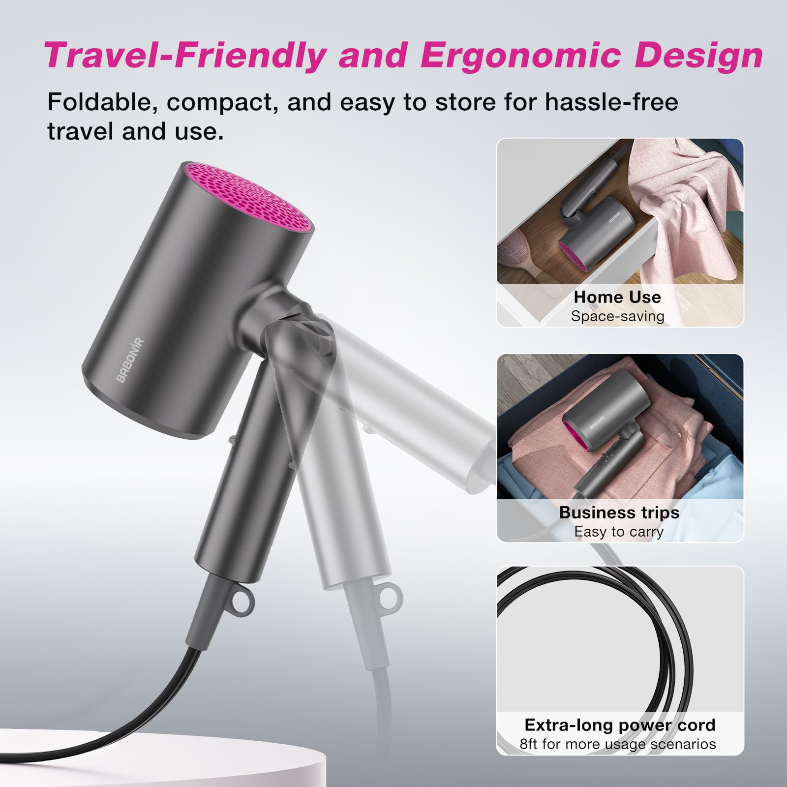 - [Foldable and Compact:] This foldable hair dryer, just 11.18 x 5.91 x 3.15 inches and 1.69 lbs. Its collapsible design saves luggage space, while its lightweight yet powerful performance ensures fast, salon-quality drying. Ideal for travelers seeking effortless style on the go