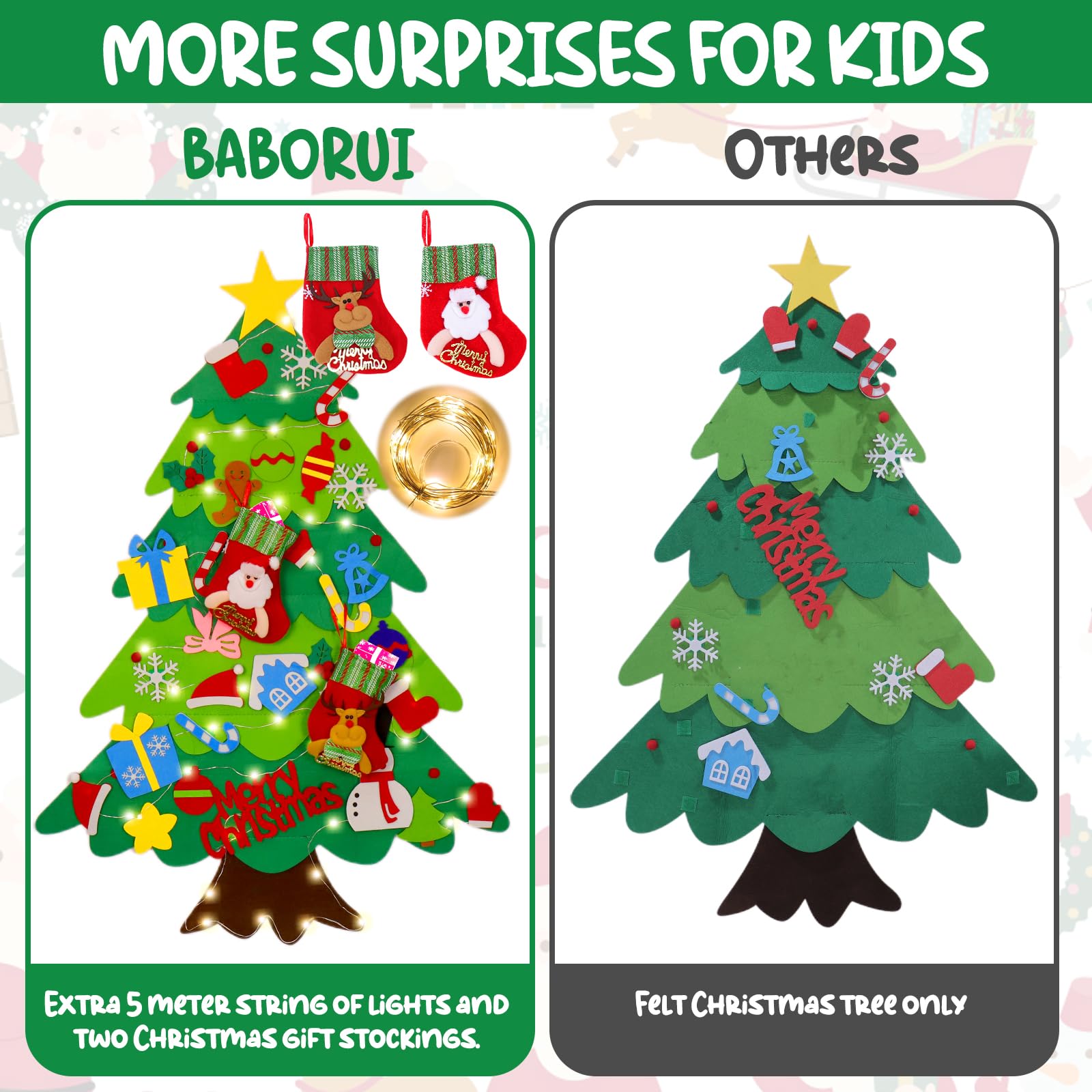 - INSPIRE CREATIVITY AND PERSONALITY: BABORUI FELT CHRISTMAS TREE SET comes with 2pcs christmas stockings for child's gifts. The child makes this Christmas tree with a wish and wakes up in the morning to find christmas gifts on the tree he made, 'Santa Claus has come to visit!' What an exciting experience this is