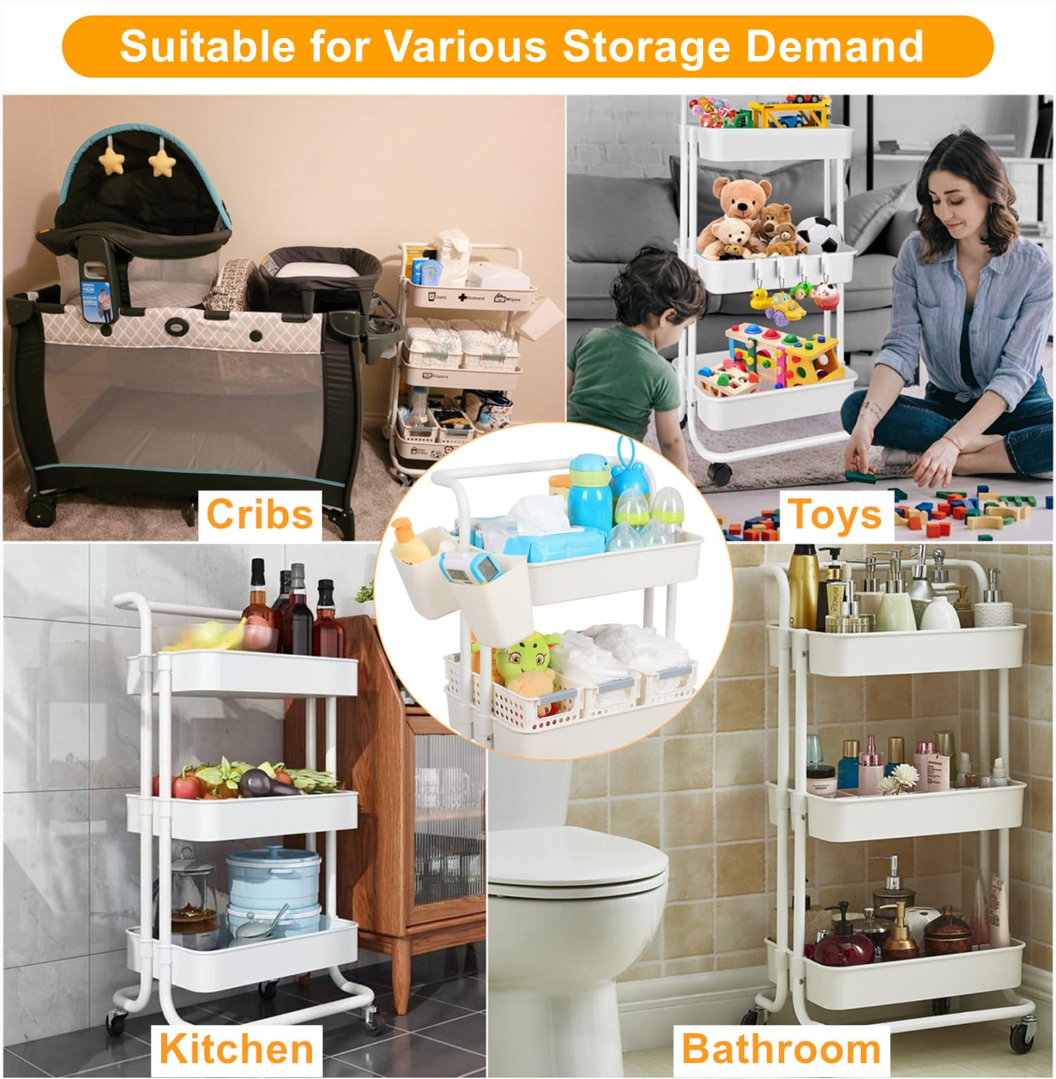 - 【NEW MOM ESSENTIALS】- The large capacity rolling diaper cart comes with 2 large storage baskets, 3 small storage baskets and 2 hanging cups, 3 tier storage bins widen and thicken, plenty of storage space holds baby diapers, wipes, wipes warmer, baby bottles, bibs, baby toys, creams/ointment and all your baby stuff need for a diaper change, solves the troubles of mothers.