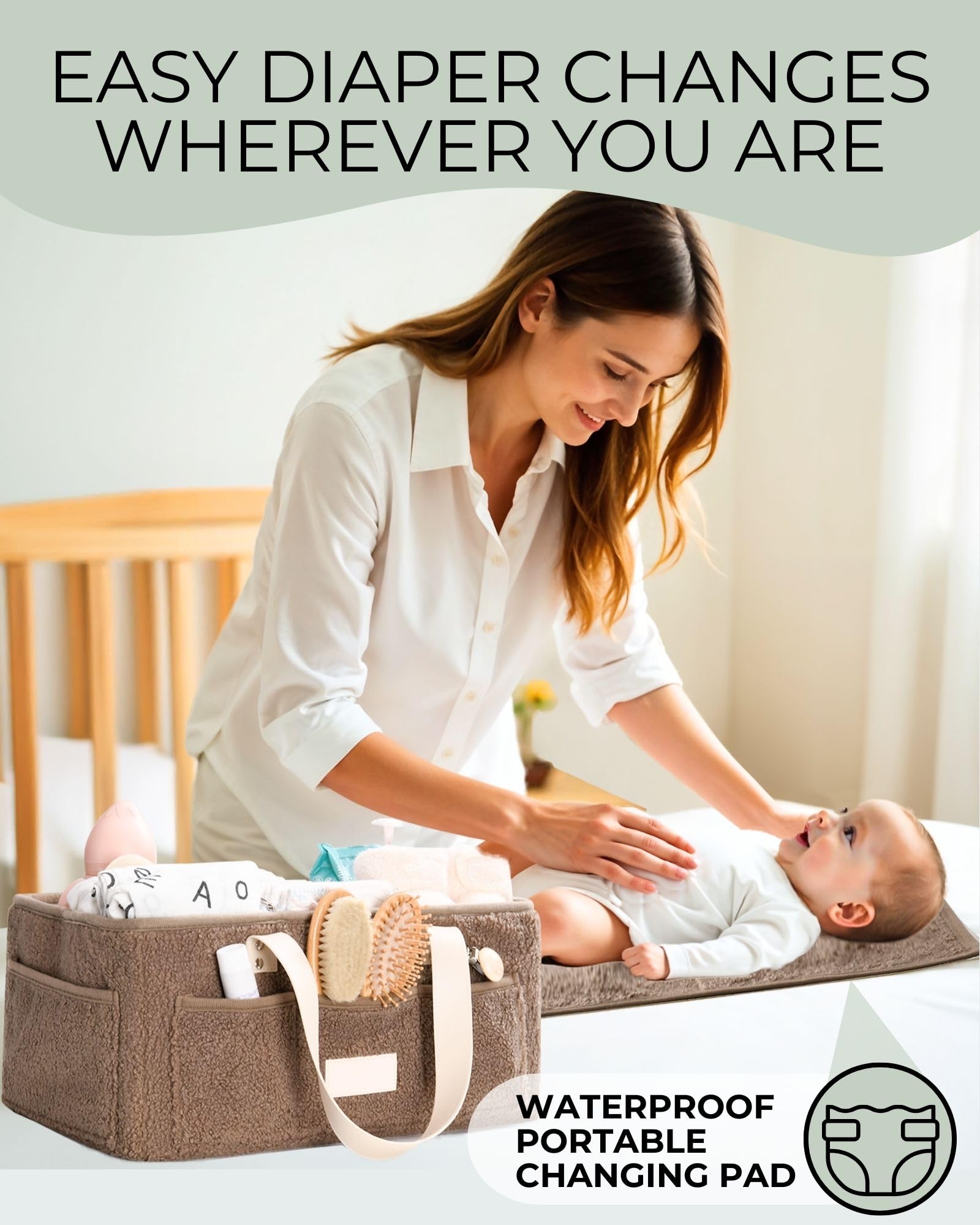 Baby Diaper Caddy Organizer with Portable Changing Mat - Teddy Fleece Nursery Storage Basket for Changing Table & Newborn Essentials – Baby Shower Gifts and Registry Must-Haves