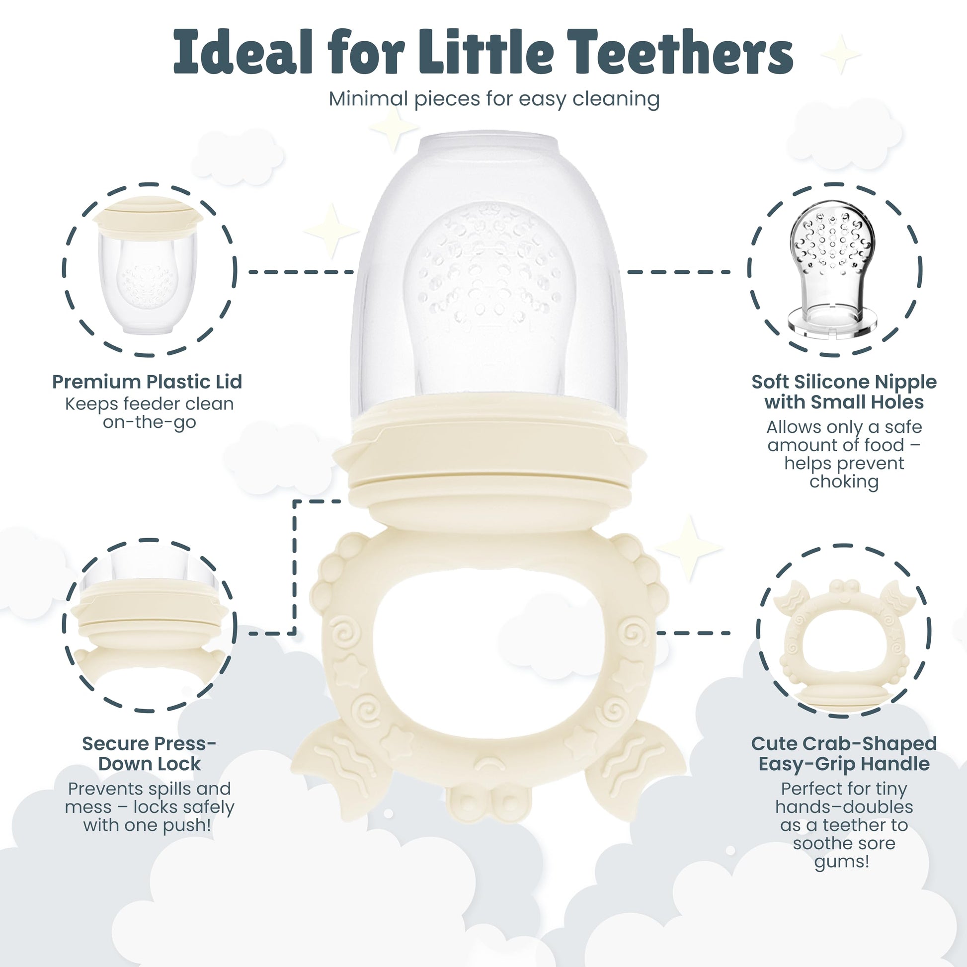 - All-in-One Feeding Solution This complete set includes a BPA-free fruit feeder, spill-resistant silicone bib, multi-portion freezer tray with lid, and 3 pacifier sizes—everything you need for your baby’s feeding and teething journey.