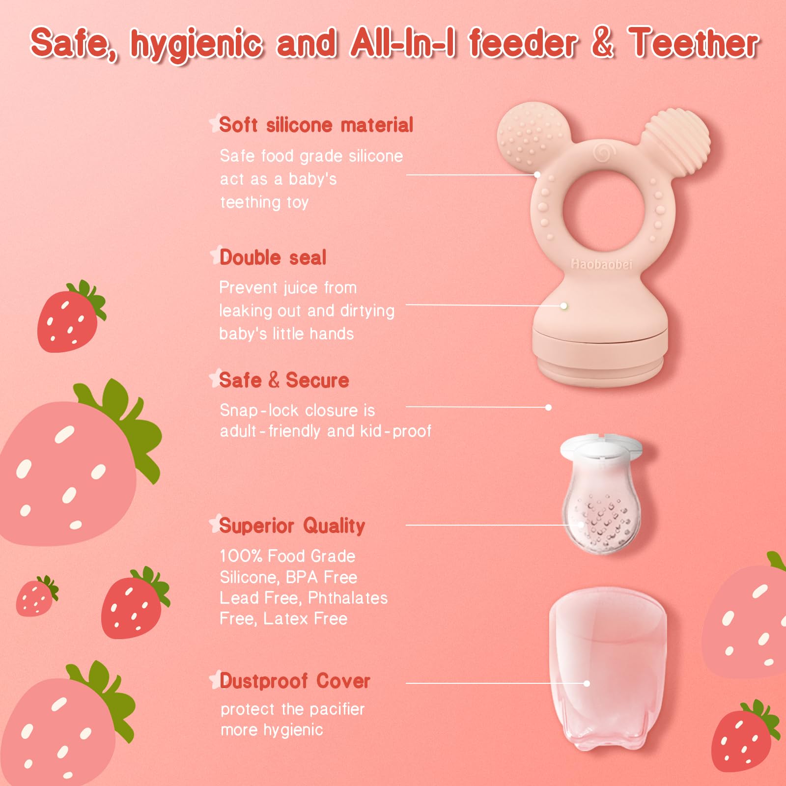 - [Effortless Hygiene] Prioritizing cleanliness and ease, our fresh fruit feeder is designed for simple dismantling and cleaning. Dishwasher safe for convenience, it can also be easily rinsed without any inaccessible spots. Microwave and boil safe, it ensures thorough sterilization for your baby's well-being.