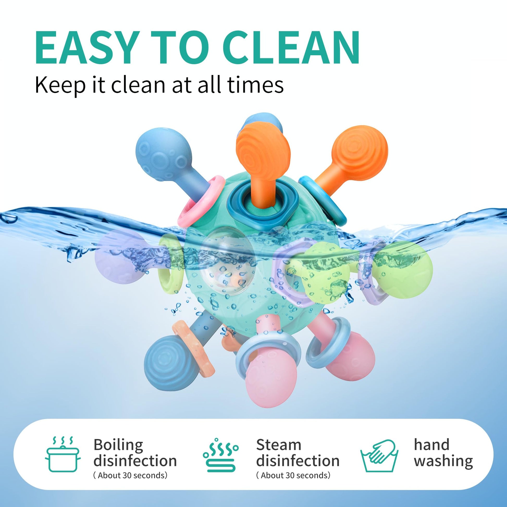 - Easy to Clean: Baby teething ball needs to be thoroughly sterilized before use by babies aged 0-6 months and 6-12 months. Baby sensory chew toys is made from heat-resistant materials and can be sterilized using ultraviolet light, boiling water, and steam. Note: Do not soak in boiling water for more than 1 minute.