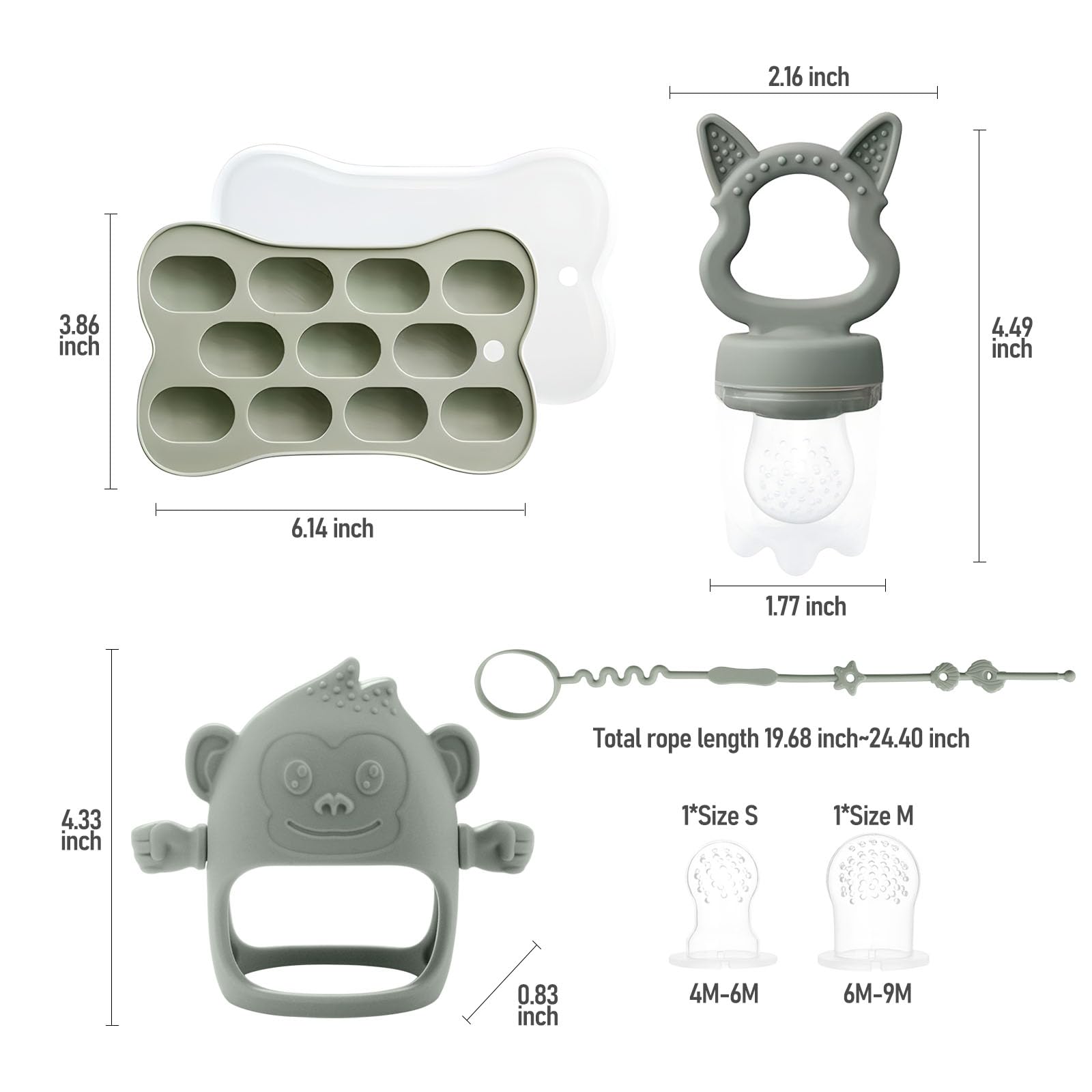 - Food Grade Silicon Feeder Set: Free of BPA, PVC and Phthalate. Included 1× food feeder, 1× Freezer tray, 1× teething toy, 1×toy strap, fits the chewing needs of babies in different months.