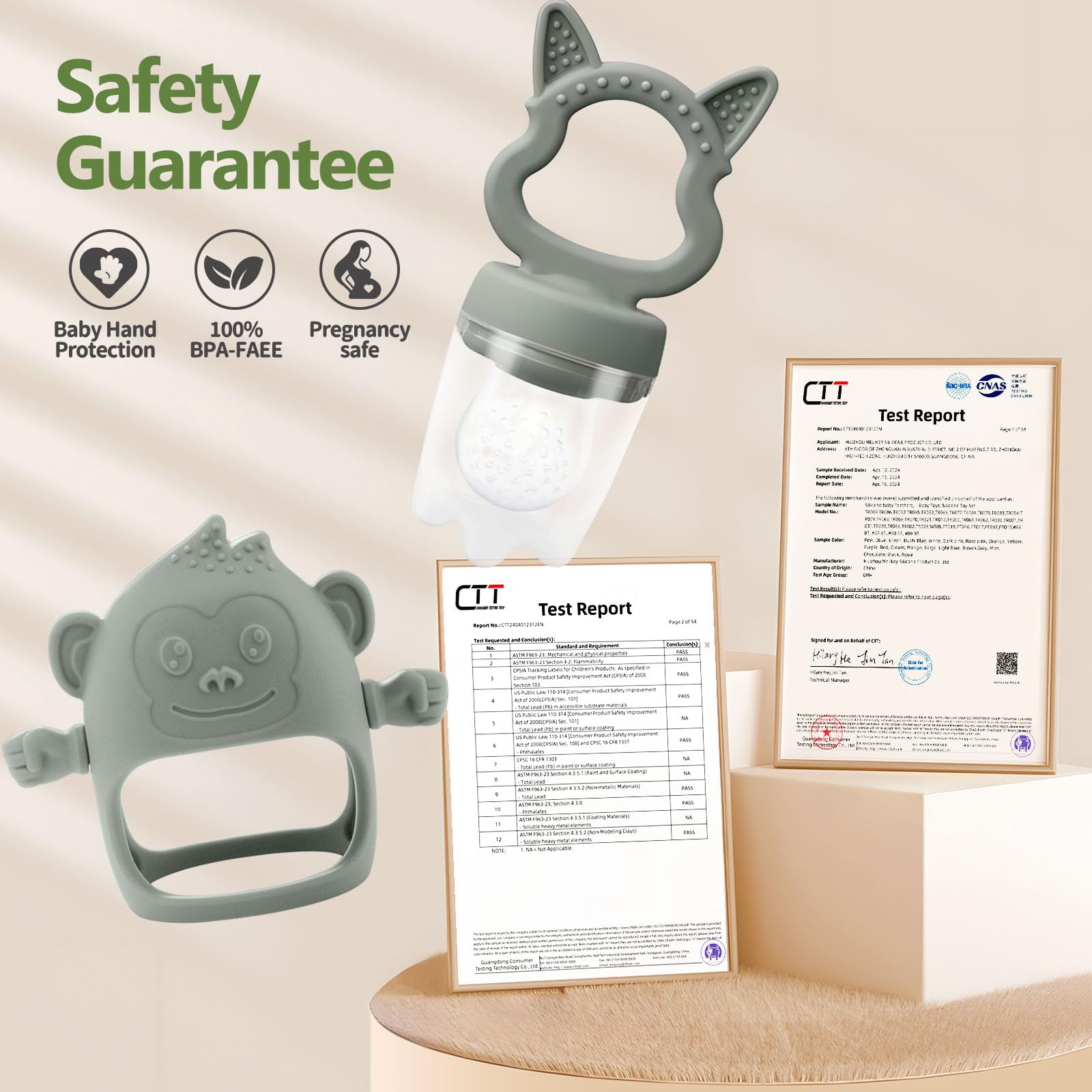 - Baby Teething Toys: Our foof feeder comes with a silicone teething mitten as well. This the perfect solution for babies who aren't yet able to hold onto teethers. The soft silicone mitten fits over little hands, and the inner bar provides extra grip support for babies to grasp.