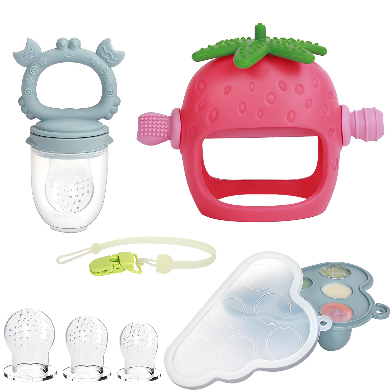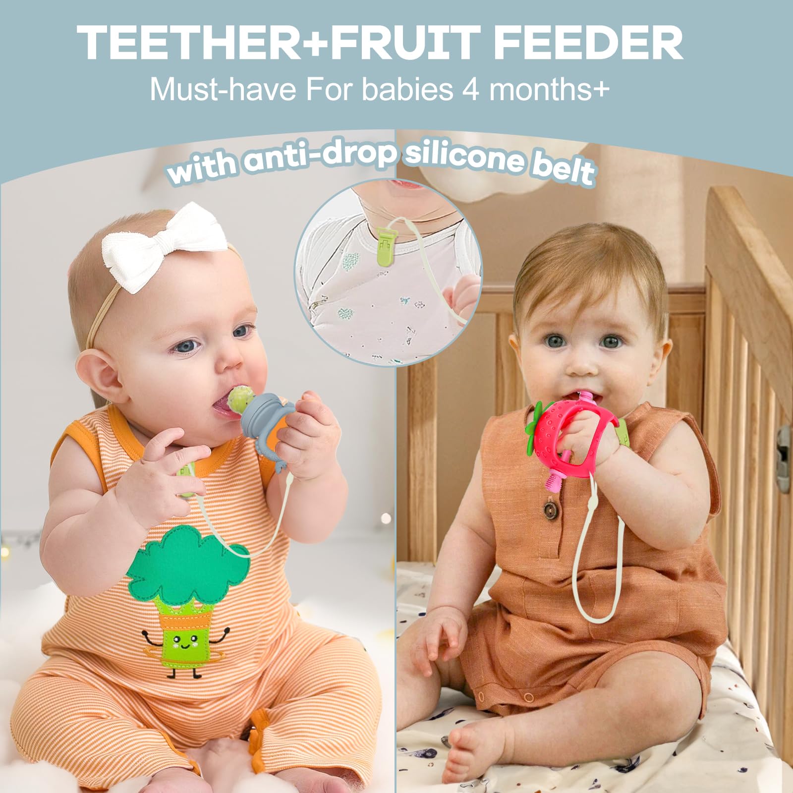 - Baby Teething Toys and Fruit Feeder Set, Silicone Teether for for Infants Babies 0+ months, Teething Relief Teether Food Feeder with Frozen Tray Sensory Toys for Babies