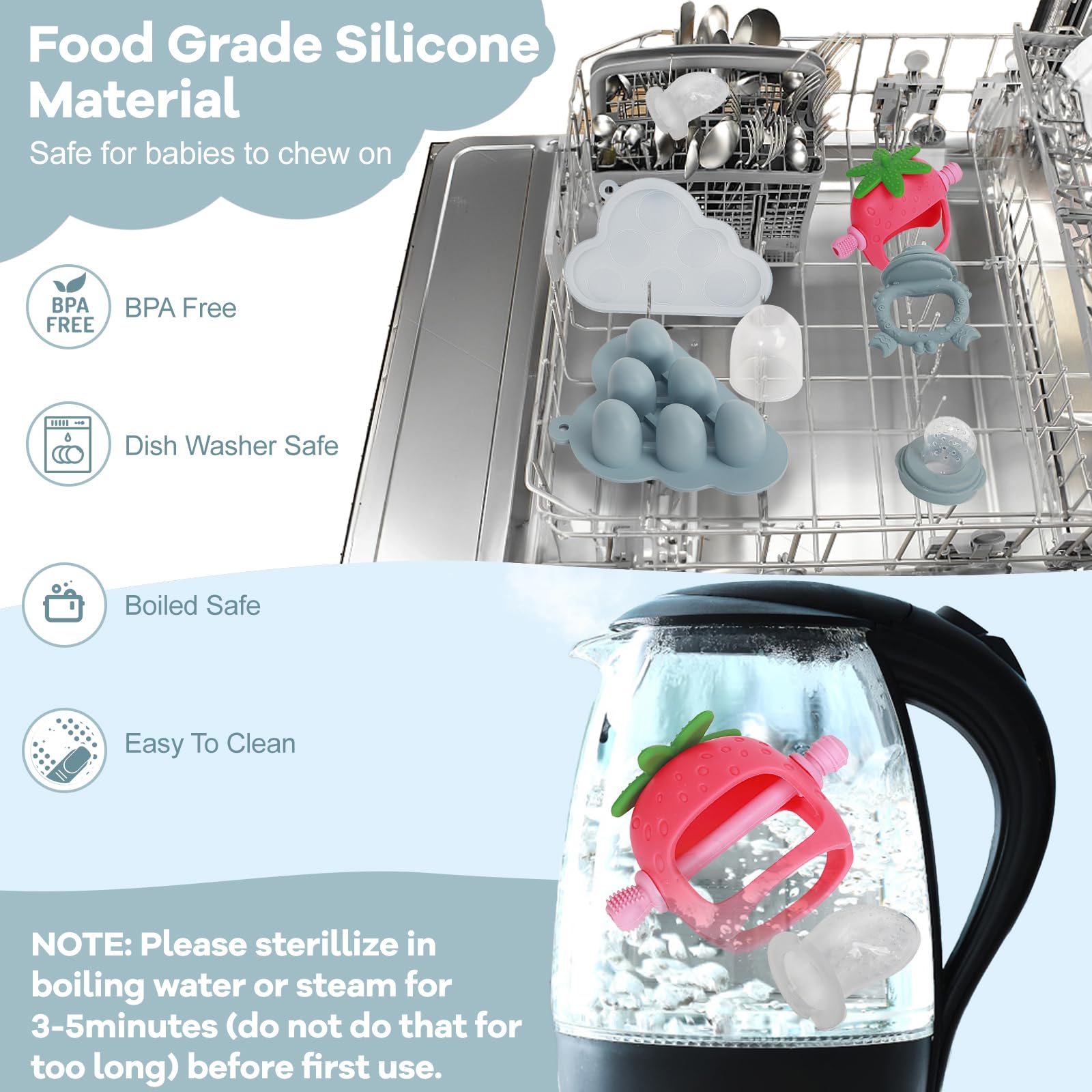 - Easy To Clean : The teething toy and baby food feeder are easy to clean, the feeder is easy to disassemble, they are dishwasher safe, we recommend immersing in boiling water for about 2-3 minute to keep them more clean, do it once per day.